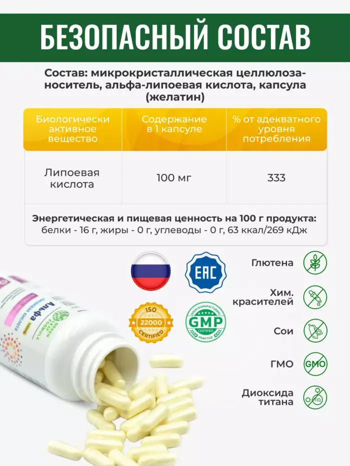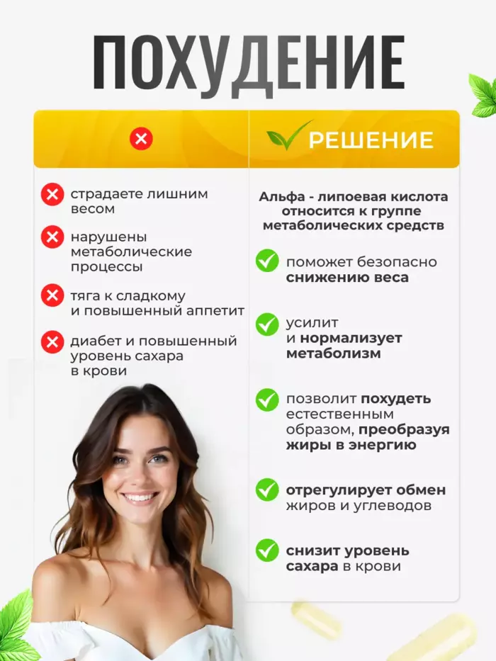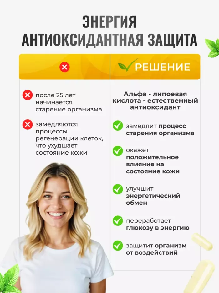 Альфалипоевая кислота (АЛК) – это мощный естественный антиоксидант, присутствующий в каждой клетке организма, она играет ключевую роль в энергетическом обмене, преобразуя глюкозу в энергию.Альфа липоевая кислота значительно снижает уровень глюкозы в крови, стимулируя ее потребление клетками и улучшает общее состояние.Также она поддерживает здоровье печени, улучшает обмен веществ и способствует выведению токсинов.АЛК защищает клетки от повреждений, вызванных свободными радикалами предотвращает старение и усиливает действие других антиоксидантов.Альфалипоевая кислота оказывает следующее действие:• замедляет процесс старения организма;• повышает уровень энергии и выносливости;• защищает печень;• способствует процессу детоксикации организма;• снижает вес;• улучшает обмен веществ;• способствует сжиганию калорий;• снижает аппетит;• снижает уровень глюкозы в крови;• снижает уровень холестерина в крови;• улучшает иммунитет и защитные функции организма. Альфалипоевая кислота может использоваться как безопасный жиросжигатель, для снижения веса и контроля аппетита. Благодаря своему воздействию на организм БАД позволяет худеть естественным образом, выводя токсины из организма (детокс) и преобразуя глюкозу в энергию.Противопоказания: индивидуальная непереносимость компонентов продукта.Перед применением рекомендуется проконсультироваться со специалистом