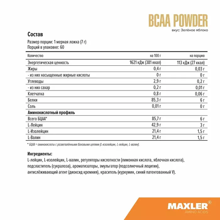 Maxler BCAA 2:1:1 отличается приятным вкусом зеленого яблока, что делает его прием не только полезным, но и приятным. Упаковка объемом 420 г обеспечивает достаточное количество продукта для длительного использования, что делает его экономически выгодным выбором для спортсменов и активных людей.