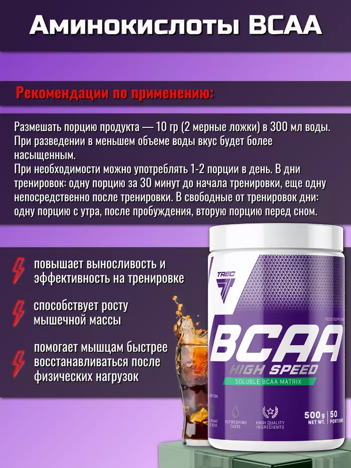 Trec Nutrition Аминокислоты BCAA High Speed Кола, 500 г — это инновационная добавка, разработанная для поддержки мышечного роста, ускорения восстановления и повышения выносливости. С уникальным вкусом колы, этот продукт станет вашим незаменимым помощником в достижении спортивных целей.