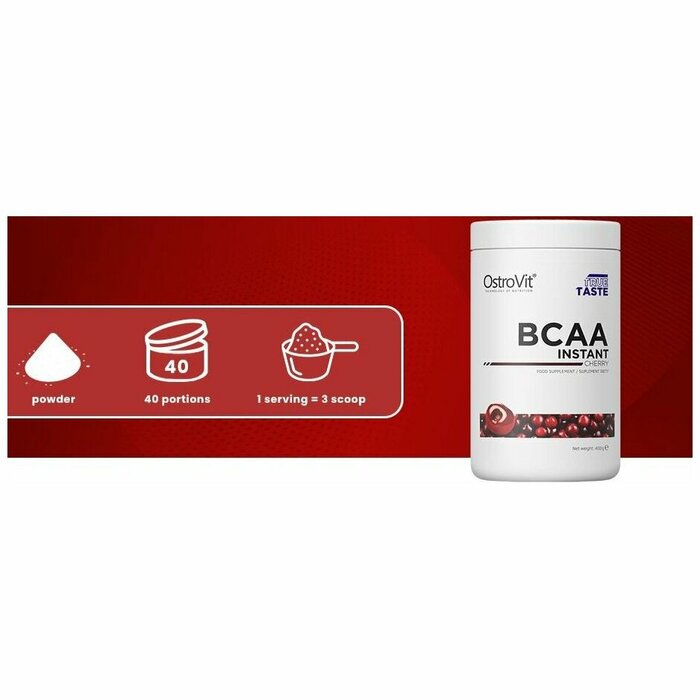 Аминокислотный комплекс BCAA 2:1:1 Instant Вишня от бренда Ostrovit — это высококачественный продукт, предназначенный для поддержки мышечного роста и восстановления после тренировок. В каждой упаковке содержится 400 г порошка с насыщенным вишневым вкусом, который легко растворяется в воде.