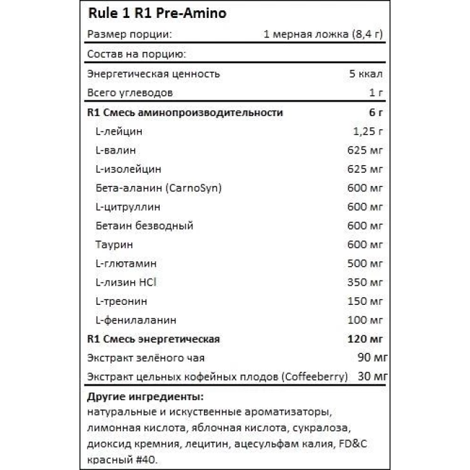 Аминокислота в порошке Rule One Proteins Pre Amino легко растворяется в воде и идеально подходит для использования до, во время и после тренировки. Продукт подходит для всех, кто стремится улучшить свои спортивные результаты и поддерживать активный образ жизни.