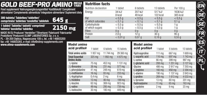 OLIMP Gold Beef-Pro Amino Mega Tabs имеют удобный формат, что позволяет легко включить их в повседневный рацион. Они идеально подходят для спортсменов, стремящихся к максимальным результатам в тренировках и соревнованиях.