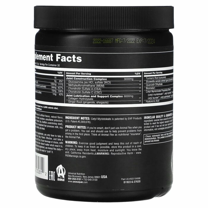 Animal Flex помогает укрепить суставы и связки, защищая их от ежедневного износа, связанного с тяжелыми тренировками, независимо от вида спорта. Компоненты порошка Animal Flex помогают поддерживать здоровую функцию, эластичность и гибкость суставов