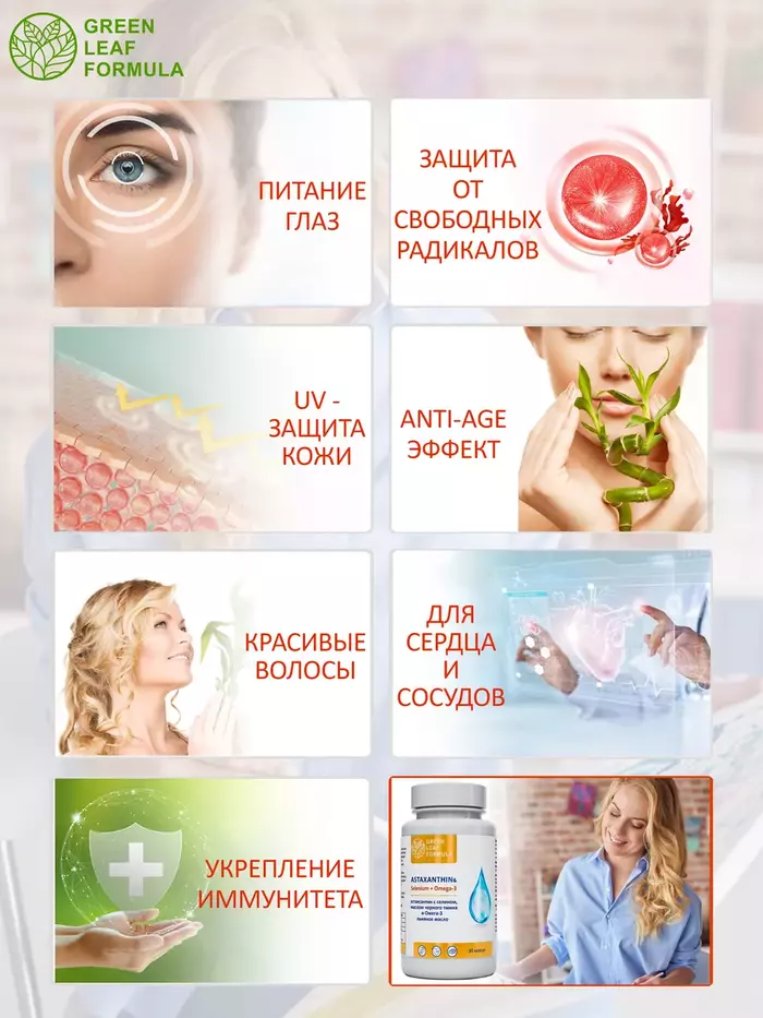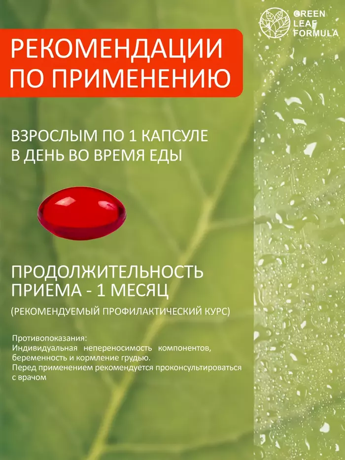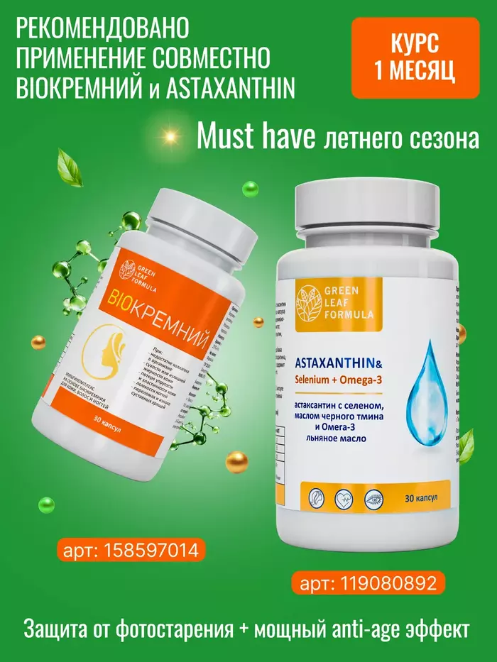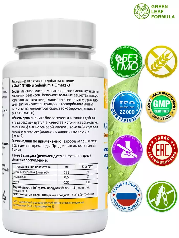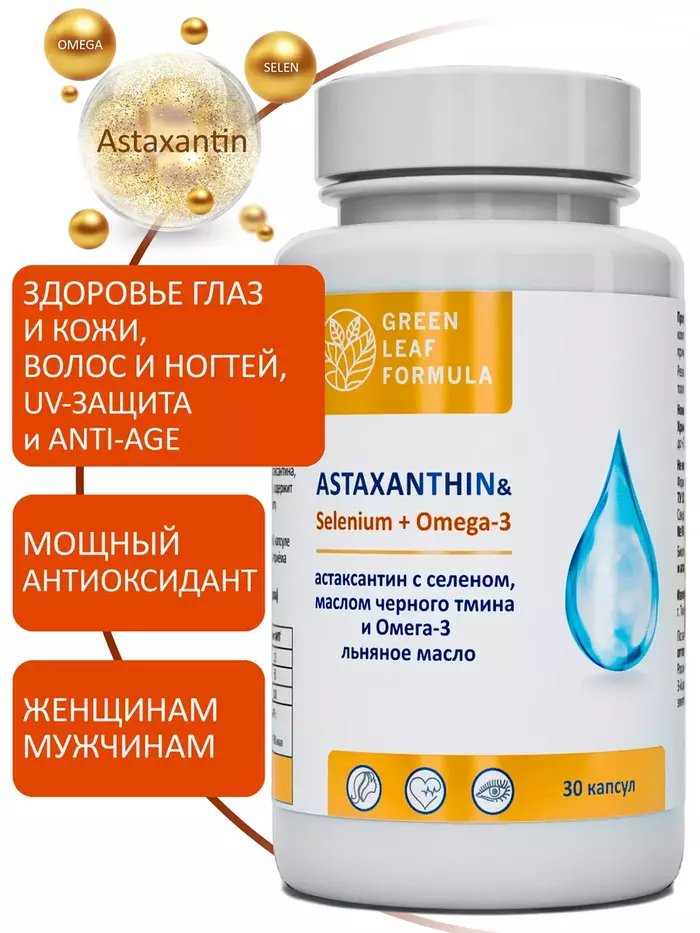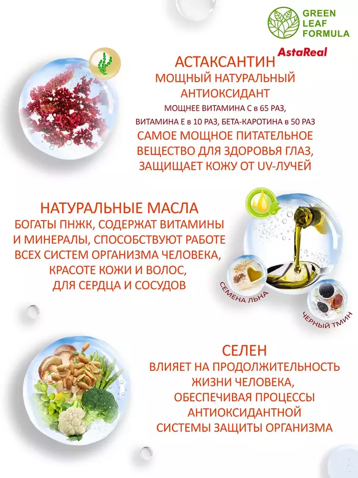 Антиоксидантный комплекс широкого действия, способствующий защите организма от свободных радикалов и их активному выведению из организма человека, защите кожи от ультрафиолетовых лучей, питанию тканей глаза и их защите от заболеваний, росту здоровых волос и красивой кожи.В том числе пищевая добавка является отличным БАДом для сердца и сосудов.Витаминный комплекс на основе уникального японского астаксантина AstaReal из микроводоросли Haematococcus pluvialis, органического селена в форме селексена, Омега3 льняного масла (омега 3) и масла черного тмина (омега 69) (вместе omega 369).Общий функционал комплекса: • Antiage эффект. Мощнейшая антиоксидантная защита.• Улучшает состояние кожи, волос и ногтей. Укрепляет и очищает стенки сосудов.• Улучшает работу сердца и сердечной мышцы.• Поддерживает здоровье глаз, питает их ткани и защищает от болезней. Предотвращает возрастное ухудшение зрения. Восполняет недостаток селена в организме. Селен необходим для нормального функционирования эндокринной системы щитовидной железы, надпочечников, предстательной железы; обеспечивает подвижность сперматозоидов и синтез тестостерона; снижает риск мужского бесплодия, вызываемый дефицитом селена; повышает женскую фертильность и благоприятно влияет на рост плода. Японский астаксантин AstaReal самый мощный натуральный природный антиоксидант, (мощнее витамина С в 65 раз, витамина Е в 10 раз, бетакаротина в 50 раз) и супер питательное вещество для глаз. Также он защищает кожу от UVлучей, тем самым не давая ей состариться. Масло черного тмина – также является мощным антиоксидантом. Оно богато омега 369 жирными кислотами, в масле присутствуют витамины A, E и D, бетакаротин, кальций, фосфор, железо, медь и другие макро и микроэлементы, способствующие нормализации функций всех систем организма человека. Льняное масло (омега3) помогает регулировать менструальный цикл, поддерживает уровень прогестерона и уменьшает риск развития остеопороза, понижает уровень холестерина, и, конечно же, это здоровые волосы, красивая кожа и крепкие ногти.Не содержит: диоксид титана, химический краситель, ГМО, сою, глютен. Витамины и БАДы Green Leaf Formula это забота о вашем здоровье каждый день. Вся наша продукция сертифицирована и изготавливается на одном из ведущих российских производств, проходя многоэтапный контроль качества. Непрерывный лабораторный контроль входного сырья и готовой продукции ведется лабораторией, аккредитованная в национальной системе Росаккредитации. Соответствие международным стандартам ISO 22 000 : 2005, GMP и серьезная научная база, гарантируют потребителю приобретение продукта высочайшего качества.