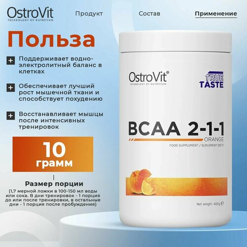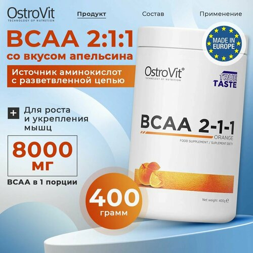 Аминокислотный комплекс BCAA 2:1:1 Апельсин от бренда Ostrovit — это высококачественная добавка, предназначенная для поддержки мышечного роста и восстановления. В каждой упаковке содержится 400 г порошка с освежающим вкусом апельсина, который легко растворяется в воде.
