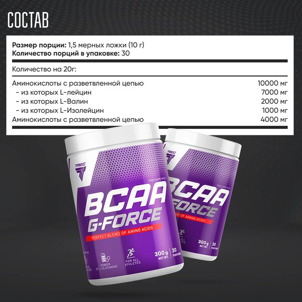 BCAA Trec Nutrition BCAA G-Force имеет приятный вкус апельсина и подходит для использования как до, так и после тренировки. Продукт идеально подходит для спортсменов, стремящихся улучшить свои результаты и поддерживать мышечную массу.