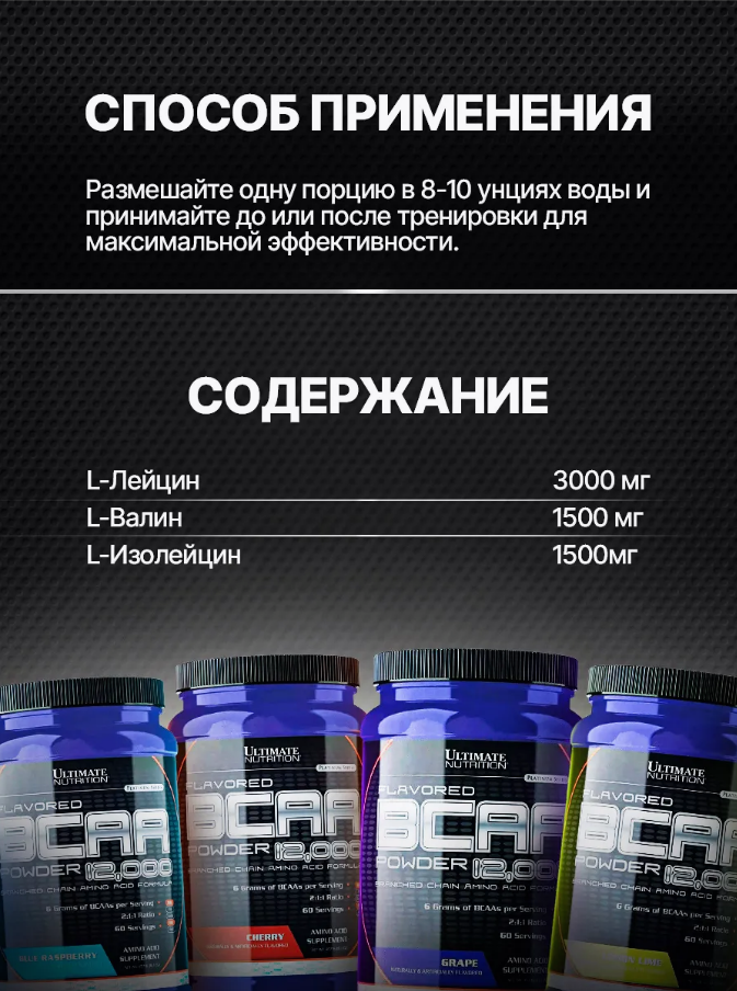 Продукт от Ultimate Nutrition имеет высокую степень растворимости и быстро усваивается организмом, что делает его идеальным выбором для спортсменов и активных людей. BCAA 12000 Flavored подходит для использования как до, так и после тренировки.