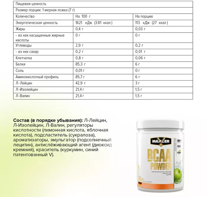 Maxler BCAA Powder яблоко имеет приятный вкус и быстро усваивается, что делает его идеальным выбором для спортсменов и активных людей. Продукт подходит для использования как до, так и после тренировки, а также в течение дня для поддержания уровня аминокислот в организме.
