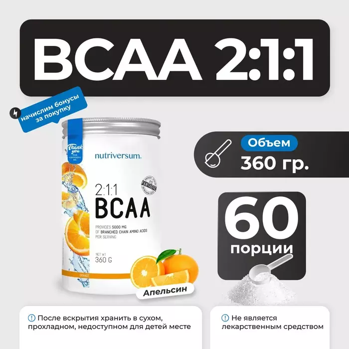 Аминокислота BCAA 2:1:1 Апельсин от бренда Nutriversum — это высококачественная добавка, предназначенная для поддержки мышечного роста и восстановления. В каждой упаковке содержится 360 г порошка с освежающим вкусом апельсина, который легко растворяется в воде.