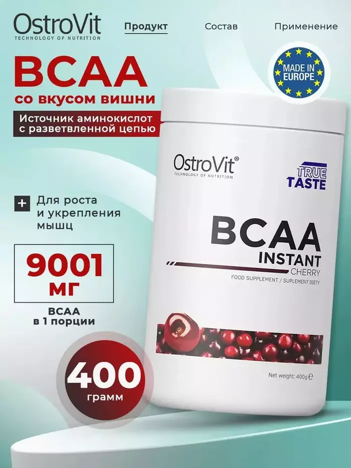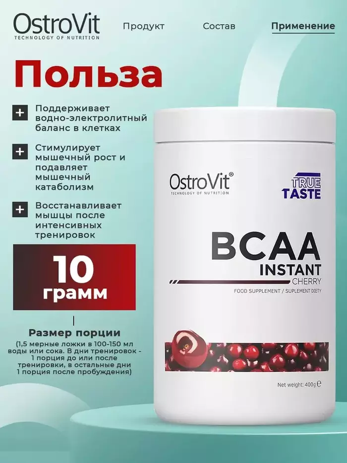 Аминокислотный комплекс BCAA Instant Вишня от бренда Ostrovit — это высококачественный продукт, предназначенный для поддержки мышечного роста и восстановления после тренировок. В каждой упаковке содержится 400 г порошка с насыщенным вишневым вкусом, который легко растворяется в воде.