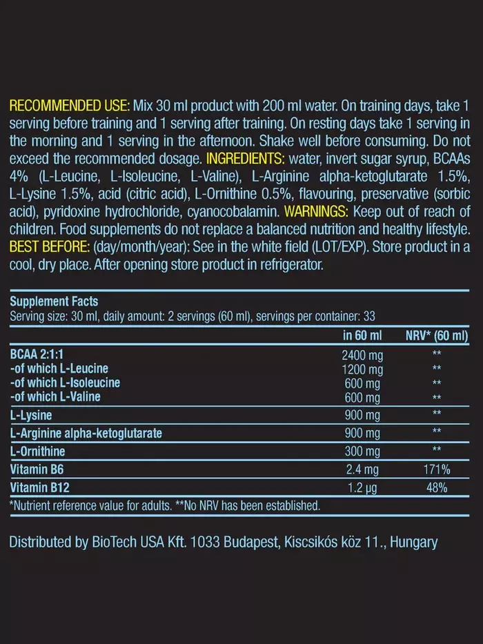 Аминокислоты BCAA Biotech 1000 мл — это высококачественная пищевая добавка, предназначенная для поддержки мышц и восстановления после интенсивных тренировок. Содержащиеся в ней аминокислоты с разветвленной цепью (лейцин, изолейцин и валин) способствуют синтезу белка и помогают уменьшить мышечную усталость.
