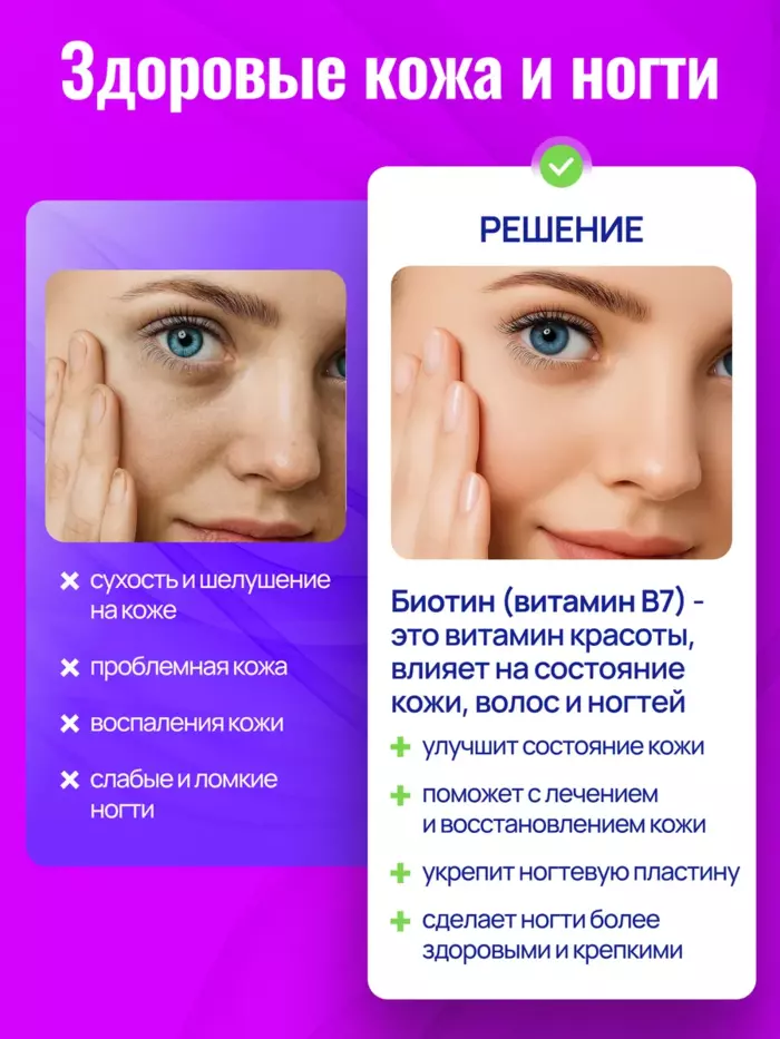 Биотин 5000 важнейший витамин для поддержания красоты и здоровья кожи, волос и ногтей. Биотин (витамин В7) играет ключевую роль в метаболизме жиров, углеводов и белков, способствует преобразованию пищи в энергию. Он участвует в синтезе кератина – основного строительного материала волос и ногтей.Биотин 5000 оказывает следующее действие:• Укрепляет волосяные фолликулы;• Стимулирует рост волос и уменьшает их выпадение и ломкость;• Поддерживает здоровье кожи;• Уменьшает сухость и воспаления на коже;• Способствует регенерации клеток и увлажнению;• Укрепляет ногти, делает их менее ломкими и более здоровыми• Способствует росту крепких и здоровых ногтей• Поддерживает метаболизм и здоровый обмен веществ. Регулярное потребление биотина (биотиналь) регулирует работу нервной, пищеварительной и сердечнососудистой систем, может улучшать кровоток внутри сердца, предотвращая риск сердечнососудистых заболеваний.Противопоказания: индивидуальная непереносимость компонентов продукта, беременность, кормление грудью. Перед применением рекомендуется проконсультироваться с врачом.