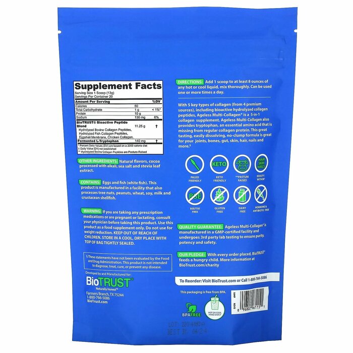 Гарантия качества. Ageless Multi-Collagen® производится на предприятии, имеющем регистрацию надлежащей производственной практики (GMP), и проходит независимые лабораторные испытания, чтобы гарантировать чистоту, эффективность и безопасность.