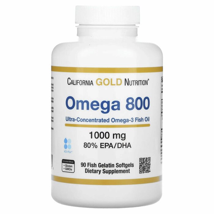 Омега 800, рыбий жир фармацевтической степени чистоты от California Gold Nutrition - это высококачественная добавка с концентрированным рыбьим жиром KD-Pür®, который обрабатывается в Германии. В каждой капсуле содержится 480 мг ЭПК (эйкозапентаеновая кислота) и 320 мг ДГК (докозагексаеновая кислота) в форме триглицеридов, предпочитаемой для лучшего усвоения организмом. Этот продукт специально разработан для людей, которые хотят дополнить свой ежедневный рацион сверхконцентрированной дозой омега-3 жирных кислот, принимаемой один раз в день.