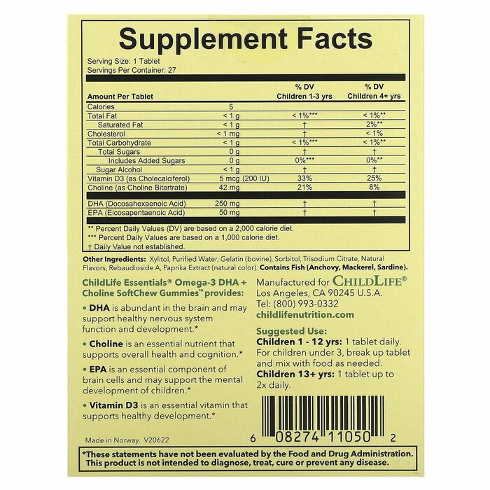 Состав омега-3 с ДГК и холином в виде жевательных таблеток SoftChew Gummies™ от ChildLife® Essentials: