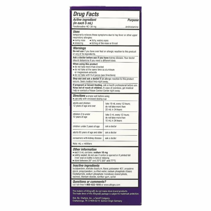 Жидкая добавка Allegra® для детей в возрасте от 2 до 12 лет разработана для облегчения симптомов аллергической реакции у детей в возрасте от 2 до 12 лет. Продукт не вызывает сонливости, поэтому не влияет на концентрацию внимания из-за сонливости. Продукт имеет жидкий вкус винограда и ягод.