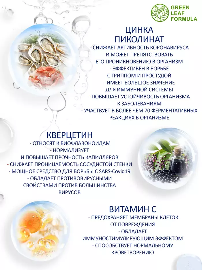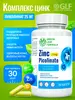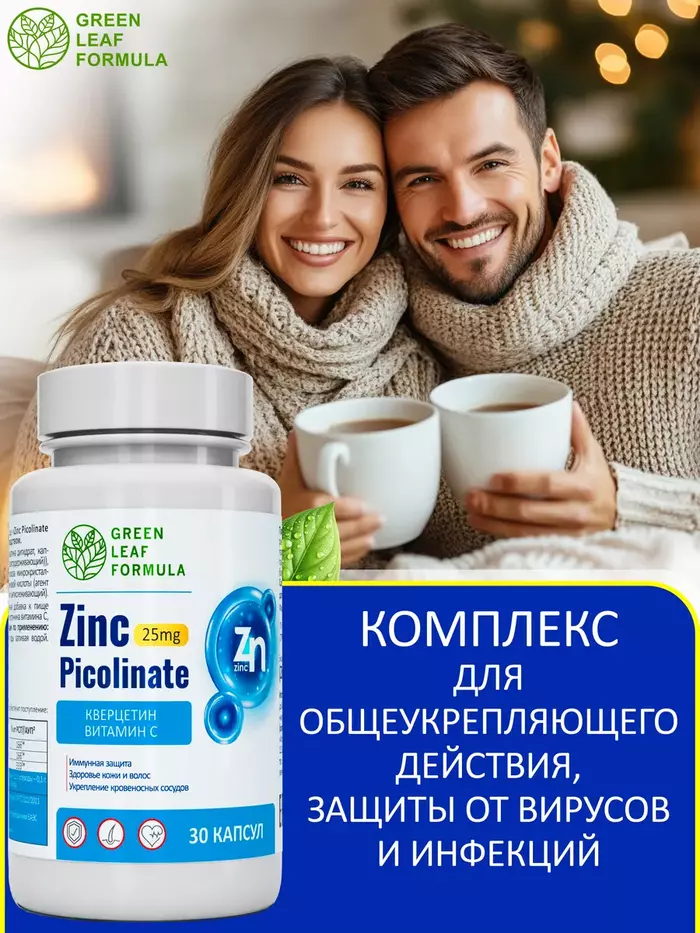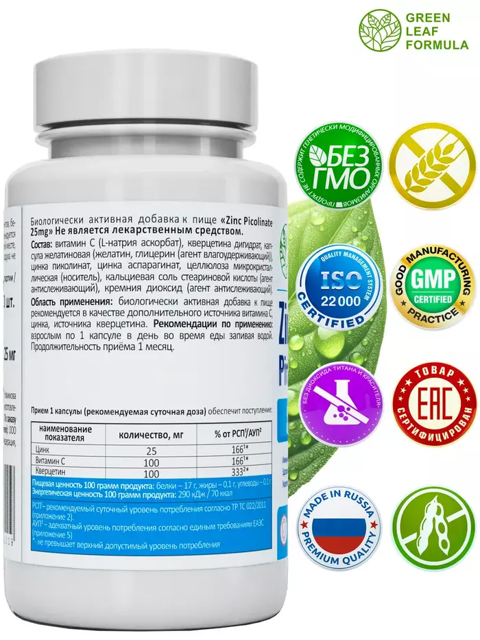 Витаминноминеральный комплекс на основе цинка пиколинат, с добавлением витамина С и кверцетина. Цинк доказал свою эффективность в борьбе с обычным гриппом и простудой.Было доказано, что цинк снижает активность коронавируса и может препятствовать его проникновению в наши клетки, одновременно снижая его мощность. В последнее время исследования изучают кверцетин как мощное средство для борьбы с SARSCovid19. Во многих исследованиях было показано, что кверцетин обладает довольно широкими противовирусными свойствами против большинства вирусов.Препарат действует: • на повышение защитных сил организма; на повышение сопротивляемости организма по отношению к факторам вызывающим активацию латентной инфекции; на уменьшение воспалительных процессов в очаге инфекции; на укрепление стенок кровеносных сосудов; как общеукрепляющее средство. Цинк в качестве кофермента участвует в более чем 70 ферментативных реакциях в организме, повышает устойчивость к инфекционным заболеваниям, обеспечивает синтез белков и метаболизм нуклеиновых кислот, жиров, углеводов, различных гормонов.Цинк имеет большое значение для иммунной системы, он участвует практически во всех звеньях системы иммунитета: в процессе созревания лимфоцитов и реакциях клеточного иммунитета; повышает защитную противомикробную активность.Кверцетин относят к биофлавоноидам. Основное значение биофлавоноидов в их капилляроукрепляющем действии и снижении проницаемости сосудистой стенки. Биофлавоноиды нормализуют и укрепляют состояние капилляров и повышают их прочность.  Витамин С предохраняет мембраны клеток организма от повреждающего действия перекисного окисления, в том числе, лимфоцитов, что является основой иммуностимулирующих эффектов; действует на механизмы иммунитета, освобождает интерферон; способствует нормальному кроветворению; влияет на обмен многих витаминов; важен для формирования костнохрящевой ткани, зубов; снижает образование холестериновых бляшек в сердечнососудистой системе; повышает сопротивляемость организма интоксикациям химическими веществами, кислородному голоданию и стрессу.Комплекс не содержит: диоксид титана, химический краситель, ГМО, сою, глютен.Противопоказания: индивидуальная непереносимость компонентов, беременность икормление грудью. Перед применением рекомендуется проконсультироваться с врачом.