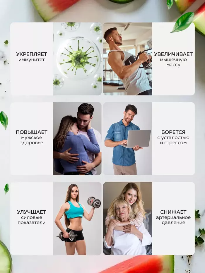 Уникальный комбинированный комплекс на основе Lцитруллина с витаминами группы В, янтарной кислотой и экстрактом яблони. Благодаря входящим компонентам препарат способствует устранению проявляющейся общей слабости и повышенной утомляемости разной степени выраженности и не зависящей от характера физической нагрузки, нормализации обменных процессов, улучшению микроциркуляции и трофики тканей, повышению работоспособности организма в целом, за счёт ускорения утилизации продуктов белкового обмена и включения в цикл Кребса, который является основным источником энергии в клетке.Комплекс направлен на:• Участие в цикле мочевины. Прием цитруллина снижает уровень аммиака, позволяет увеличить потребление белка, что способствует нормализации массы тела.• Поддержание функции мышц. Цитруллин участвует в синтезе АТФ и направлен на снижение чувства усталости мышц, их восстановлению.• Оказание противовоспалительного и антибактериального действия.• Нормализацию метаболизма глюкозы и профилактику сахарного диабета. Синергистами противодиабетического действия цитруллина являются витамин В3• Оказание нейропротективного действия, увеличивает мозговую активность.• Выведение токсинов, в том числе после алкоголя.• Повышение активности и энергии. Комплекс с цитруллином отлично подойдет спортсменам, людям, ведущим активный образ жизни, а также пожилым людям для снижения артериального давления.Комбинация Цитруллина и Яблочной кислоты (малата) является синергетической: яблочная кислота участвует в цикле Кребса, основном источнике энергии в клетке; цитруллин участвует в орнитиновом цикле, т.е. способствует детоксикации аммиака, образующегося в процессе распада белков.Янтарная кислота улучшает питание мозга, тем самым увеличивая мозговую активность, улучшает функциональное состояние нервной ткани после перенесенных повреждений, повышает стрессоустойчивость.Янтарная кислота способствует выведению токсинов путем стимулирования внутриклеточного метаболизма и дыхания в клетках, уменьшает токсическое действие алкоголя.Витамины группы В (в комплексе В1, В2, В3, В5, В6, В9, В12) участвуют в обмене веществ и необходимы для нормального функционирования центральной и периферической нервной системы. Не содержит: диоксид титана, химический краситель, ГМО, сою, глютен.Противопоказания: Индивидуальная непереносимость компонентов. Перед применением рекомендуется проконсультироваться с врачом.