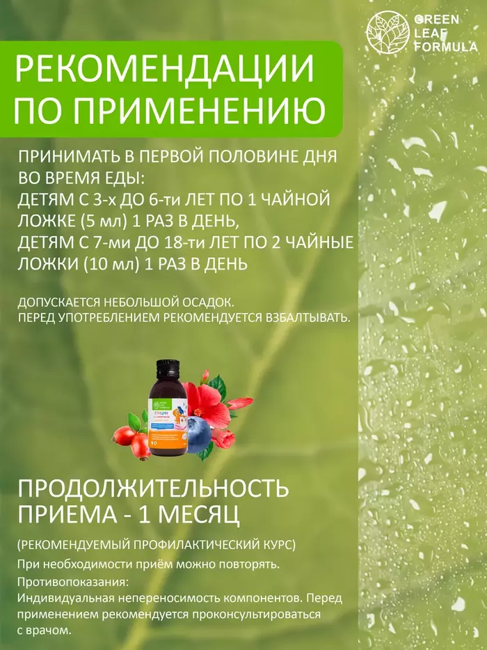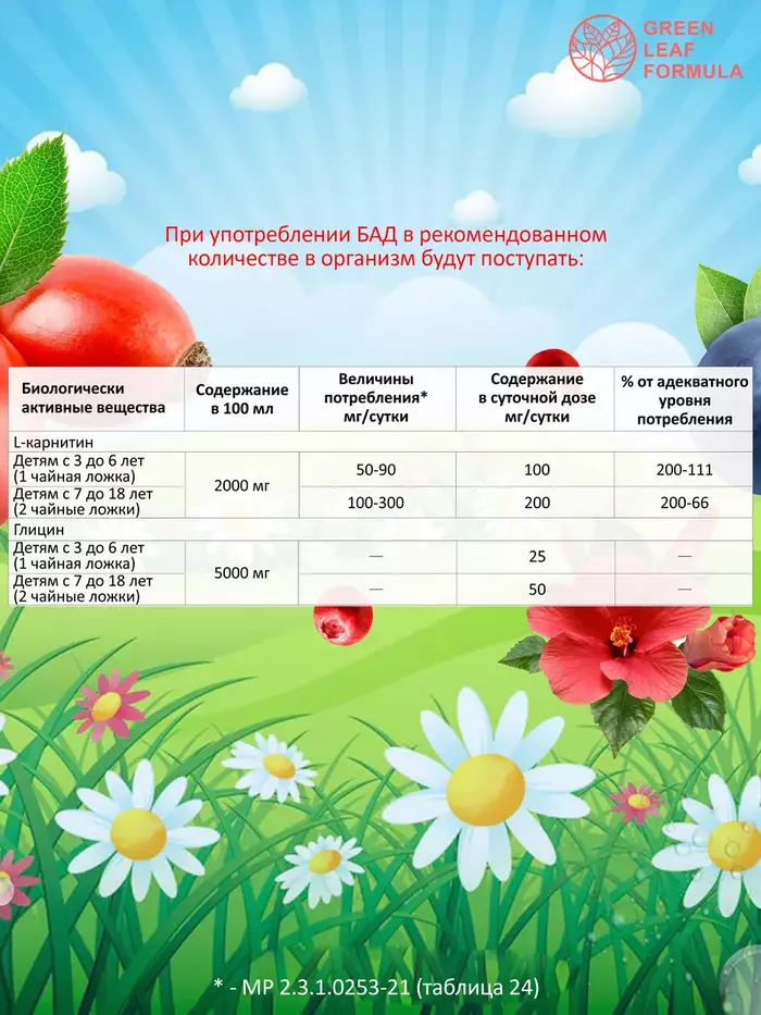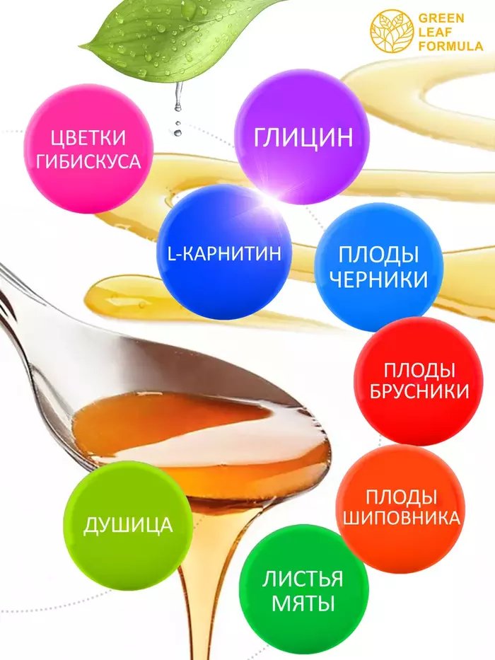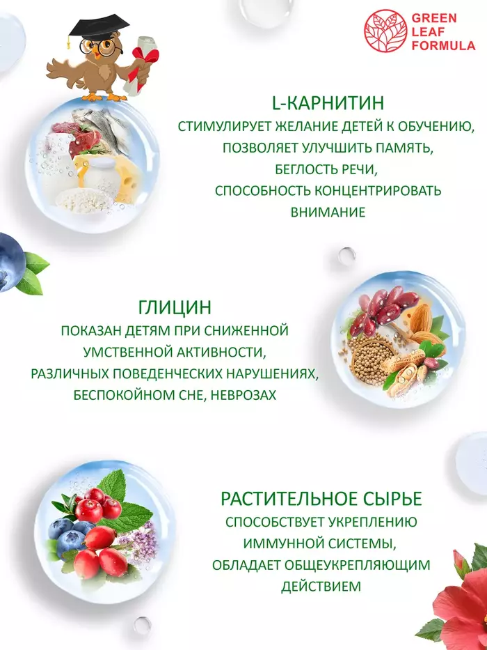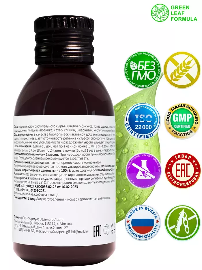 Глицин с Lкарнитином — это сироп для детей от 3 лет и подростков для здоровья, для работы мозга и энергии вашего ребенка на основе водного настоя из растительного сырья: цветки гибискуса, трава душицы, плоды черники, листья мяты, плоды брусники, плоды шиповника; а также глицина и Lкарнитина.Детский сироп рекомендуется в качестве источника глицина и Lкарнитина.Компоненты и активные вещества детского сиропа, входящие в состав БАД, применяют:• для повышения устойчивости ребенка к стрессу, при повышенной возбудимости;• для повышения работоспособности;• для выносливости;• при нарушении сна и аппетита;• для снижения утомляемости, тревоги и раздражительности;• для улучшения концентрации внимания;• при гиперактивности и синдроме дефицита внимания;• для укрепления иммунитета.LКарнитин – незаменимый компонент питания для оптимального развития организма ребенка, являясь биоактивным веществом, вносит положительный вклад в нормализацию обменных процессов организма, снижает утомляемость при длительной мозговой деятельности; повышает работоспособность и выносливость организма во время занятий спортом или при любой другой физической активности; сокращает период времени, необходимого для восстановления сил, обеспечивает чувство бодрости.Глицин – это аминокислота, играющая важную роль в формировании и работе нервных клеток головного мозга, оказывает успокаивающее действие на нервную систему в период высоких эмоциональных нагрузок и переутомления, выступает как антистрессовый компонент, помогает нервной системе ребенка более сдержанно реагировать на внешние возбудители, снижая проявление агрессии, конфликтности, раздражительности.Цветки гибискуса способствуют стимуляции умственных способностей и улучшению памяти.Трава душицы обладает явным седативным эффектом, входит в состав популярных успокоительных средств и разрешена для применения детям.Плоды черники, брусники и шиповника обладают антиоксидантным действием, повышают активность мозговой деятельности.Листья мяты обладают выраженными успокоительным, спазмолитическим свойствами, способствуют нормализации нервной системы, уменьшению перенапряжения.Безалкогольный сироп Глицин с Lкарнитином в стеклянной бутылочке 100 мл, не является лекарственным средством.Противопоказания: индивидуальная непереносимость компонентов. Перед применением рекомендуется проконсультироваться с врачом.Не содержит: диоксид титана, химический краситель, ГМО, сою, глютен.Витамины и БАДы Green Leaf Formula это забота о вашем здоровье каждый день. Вся наша продукция сертифицирована и изготавливается на одном из ведущих российских производств, проходя многоэтапный контроль качества. Непрерывный лабораторный контроль входного сырья и готовой продукции ведется лабораторией, аккредитованная в национальной системе Росаккредитации. Соответствие международным стандартам ISO 22 000 : 2005, GMP и серьезная научная база, гарантируют потребителю приобретение продукта высочайшего качества.