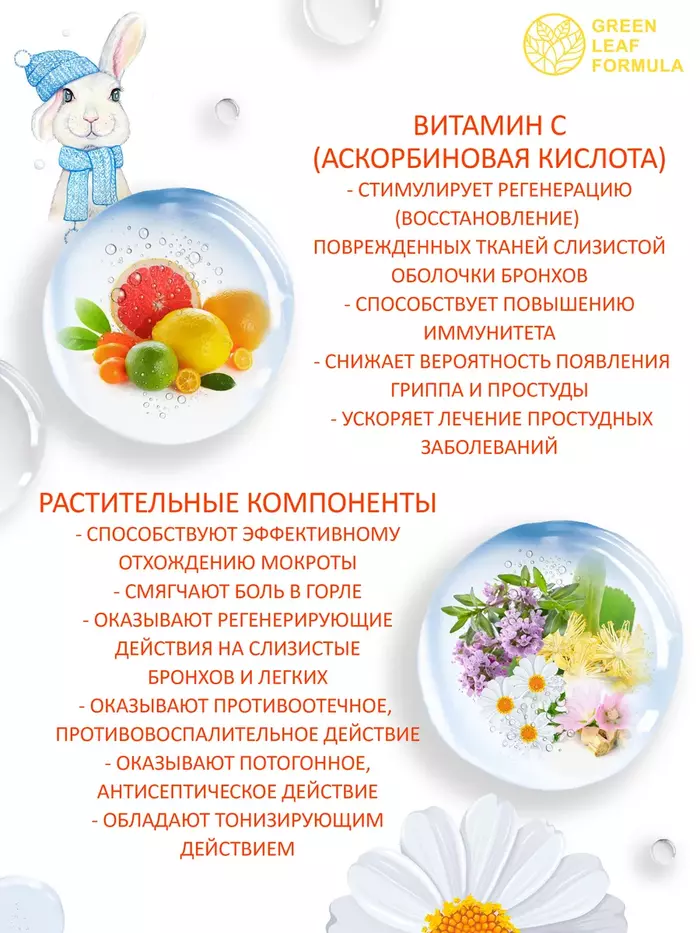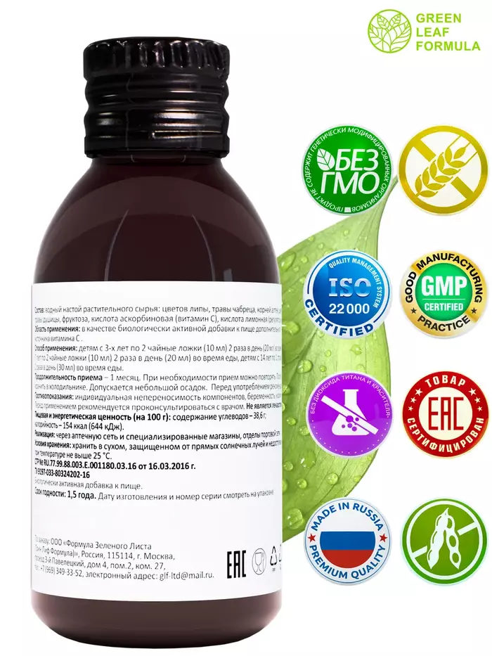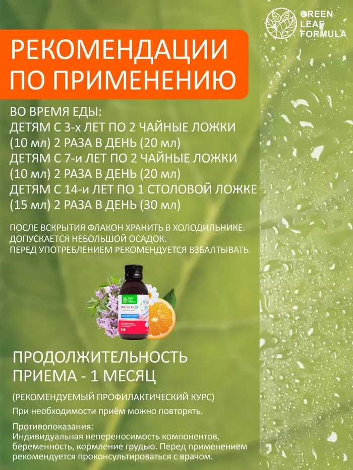 Бронхи Кидс это сироп, применяется при бронхолегочных и простудных заболеваниях у детей с 3х лет и подростков, на основе водного настоя из витамина С (аскорбиновая кислота) и растительного сырья: цветов липы, травы чабреца, корней алтея, цветков ромашки, травы душицы.Детский сироп не вызывает привыкания у ребенка, поэтому его можно применять в течение длительного времени, пока не пройдут симптомы заболевания или для профилактики. Рекомендуется бальзам и в качестве дополнительного источника витамина С. Компоненты и активные вещества, входящие в состав, оказывают отхаркивающее и противовоспалительное действия, благотворно влияют на состояние легких и бронхов, используются для профилактики осложнений при простуде и гриппе, для укрепления иммунитета.Витамин С нормализует обменные процессы в организме, а также стимулирует регенерацию (восстановление) поврежденных тканей слизистой оболочки бронхов. Способствует повышению иммунитета, снижению вероятности появления гриппа и простуды, а также аскорбиновая кислота ускоряет лечение этих заболеваний. Витамин C считается одним из важных для человеческого организма антиоксидантов.Липа оказывает противомикробное, противовоспалительное и мягчительное действие, используется для полоскания полости рта и зева при воспалительных заболеваниях и ангинах. Облегчает эвакуацию мокроты из бронхов и легких, смягчает боль в горле. Липу применяют в качестве потогонного и жаропонижающего средства при ангине, бронхите, простудных заболеваниях.Чабрец обладает антисептическим, противовоспалительным и обезболивающим свойствами. Наиболее часто применяют чабрец при простуде в качестве бронхорасширяющего и отхаркивающего средства.Корень алтея оказывает противоотечное, противовоспалительное и регенерирующее действия на слизистые оболочки бронхов и легких. Слизистые вещества в составе алтея мягко обволакивают поверхность бронхов и легких, способствуя эффективному отхождению мокроты.Ромашка оказывает потогонное, антисептическое и противовоспалительное действия, используется при лечении простудных заболеваний, инфекциях респираторного тракта, сопровождающихся кашлем.Душица оказывает мощное антисептическое действие. Тонизирует, подавляет воспалительные процессы и обладает слабым мочегонным действием.Сироп Бронхи Кидс в стеклянной бутылочке 100 мл, не является лекарственным средством.Не содержит: диоксид титана, химический краситель, ГМО, сою, глютен.Способ применения: детям с 3х лет по 2 чайные ложки (10 мл) 2 раза в день (20 мл) во время еды; детям с 7 лет по 2 чайные ложки (10 мл) 2 раза в день (20 мл) во время еды; детям с 14 лет по 1 столовой ложке (15 мл) 2 раза в день (30 мл) во время еды.Продолжительность приема – 1 месяц. При необходимости прием можно повторять.После вскрытия флакон хранить в холодильнике. Допускается небольшой осадок. Перед употреблением рекомендуется взбалтывать. Противопоказания: индивидуальная непереносимость компонентов, беременность, кормление грудью. Перед применение рекомендуется проконсультироваться с врачом. Витамины и БАДы Green Leaf Formula это забота о вашем здоровье каждый день.