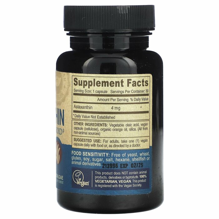 Астаксантин, используемый в этом продукте, получен из микроводоросли Haematococcus pluvialis без ГМО, выращиваемой в США и / или Европе с использованием чистой воды.