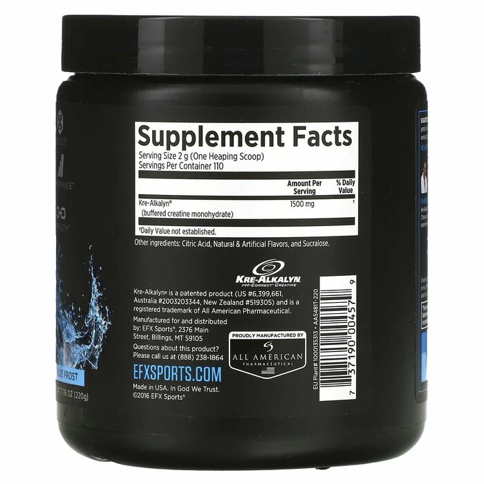 Kre-Alkalyn® EFX — это единственный продукт из моногидрата креатина с кислотностью 12, потому что его молекулы синтезируются посредством буферизации агентов с применением запатентованного (№ 6339661) производственного процесса, обеспечивающего необходимую кислотность.