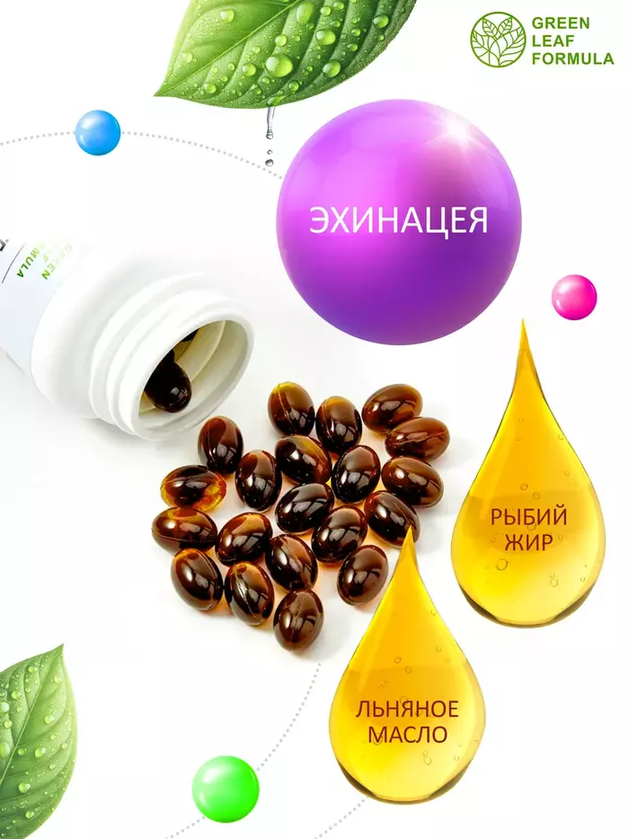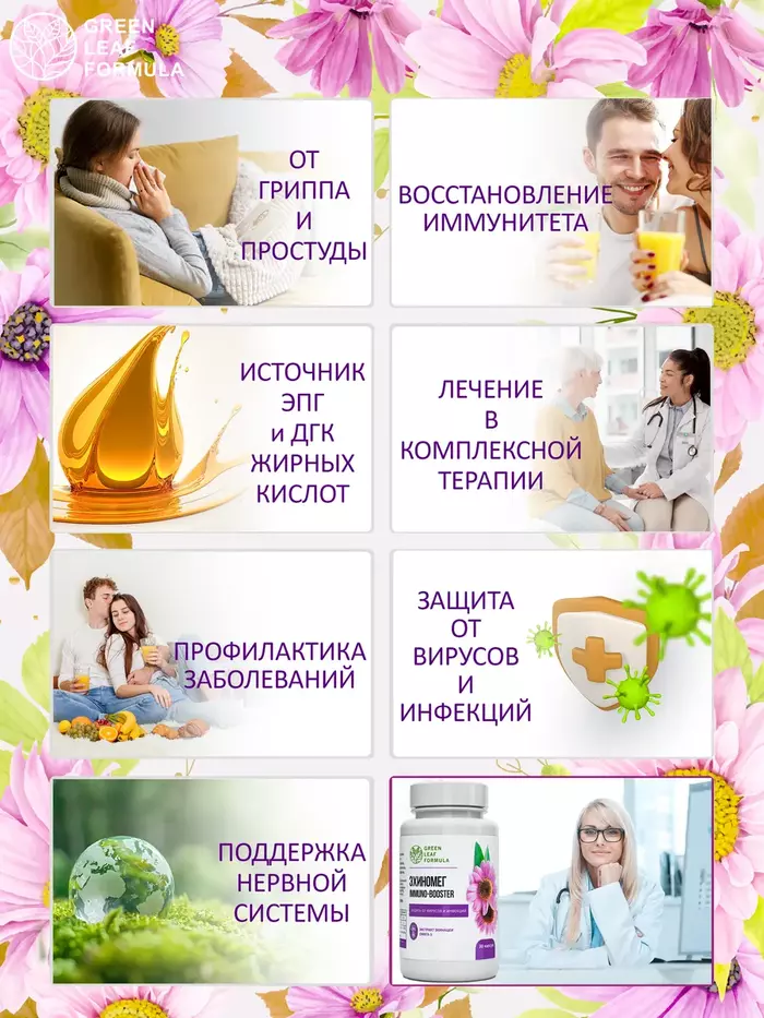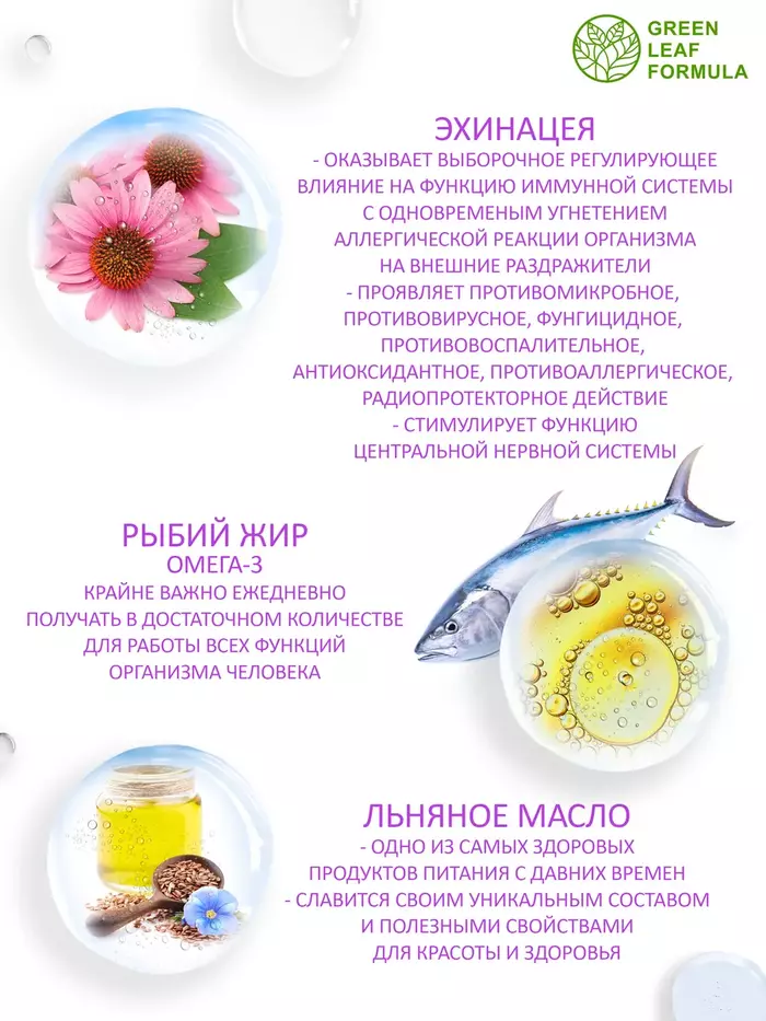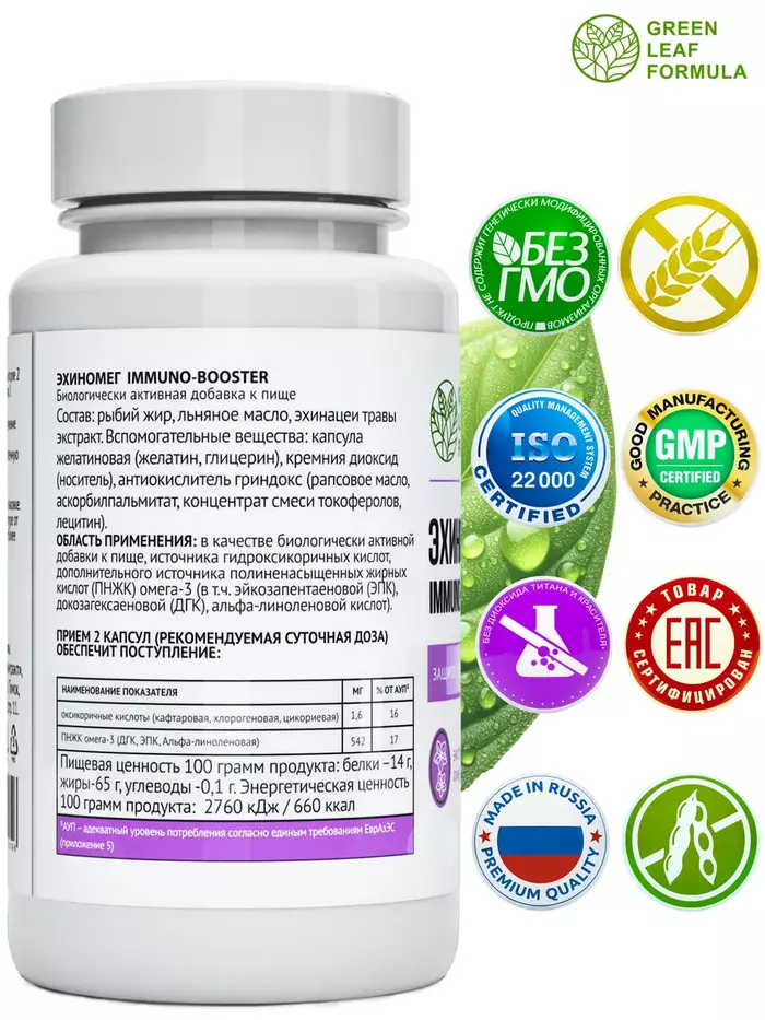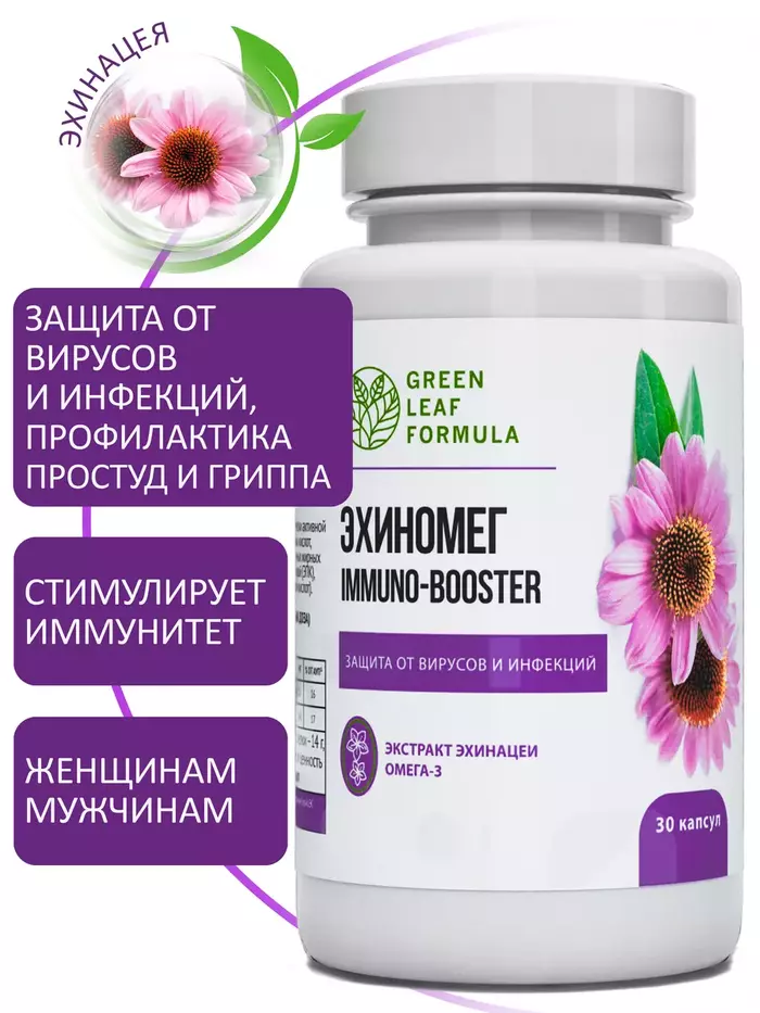 Эхиномег IMMUNOBOOSTER натуральный биологически активный комплекс на основе эхинацеи в сочетании с омега 3 рыбий жир и льняное масло для восстановления и поддержания иммунитета – способствует профилактики и лечению в комплексной терапии ряда инфекционных и неинфекционных заболеваний, наилучшим образом восстанавливает иммунитет, в том числе в период распространения гриппа и ОРВИ. Комплекс, благодаря входящим в состав компонентам, оказывает действие: • иммуномодулирующее и противовирусное, способствует правильному функционированию иммунной системы и поддерживает защитные силы организма; ускоряет выздоровление, проявляет профилактическое действие, предотвращая развитие бактериальных, грибковых и вирусных заболеваний; обладает противовоспалительной и антиоксидантной активностью, снижает тяжесть течения и риск развития осложнений острых и хронических воспалительных заболеваний; общеукрепляющий эффект, помогает организму быстрее восстанавливаться после перенесенных заболеваний, в период эпидемий, при резкой смене климата, в стрессовых ситуациях. ЭКСТРАКТ ЭХИНАЦЕИ иммуномодулятор естественного происхождения. Хорошо известный, изученный и востребованный на протяжении многих лет компонент в качестве средства профилактики и лечения простуды и ОРВИ. Благодаря этому компоненту БАД уменьшает воспалительные процессы в очаге инфекции, быстрее восстанавливает организм после болезни, снижает риск развития инфекционных заболеваний, оказывает противомикробное, противовирусное, фунгицидное, противовоспалительное, антиоксидантное, иммуностимулирующее, мембраностабилизирующее, противобактериальное, противоаллергическое, радиопротекторное действие, стимулирует функцию центральной нервной системы. Витамины омега3 в составе способствуют снижению холестерина и триглицеридов крови, оказывает профилактическое действие атеросклероза, гипертонической болезни, сердечнососудистых заболеваний, способствует предотвращению тромбообразования и нарушению мозгового кровообращения. Источники OMEGA3 в составе препарата льняное масло и высококачественный рыбий жир исландского производителя. Регулярный прием OMEGA 3 улучшает состояние кожи и волос, они принимают здоровый и сияющий вид.Не содержит: диоксид титана, химический краситель, ГМО, сою, глютен. Витамины и БАДы Green Leaf Formula это забота о вашем здоровье каждый день.