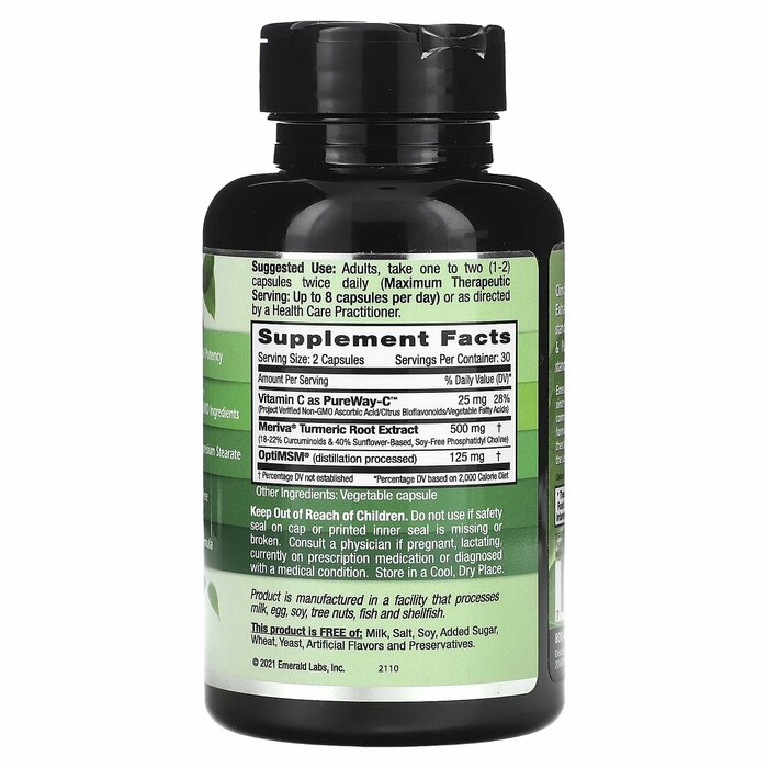 Клиническая смесь экстракта корня куркумы Meriva® (биодоступность в 29 раз выше, чем у стандартной куркумы), OptiMSM® (дистиллированная) и PureWay-C ™ (срок хранения 12 часов по сравнению со стандартными 4–5 часами.1