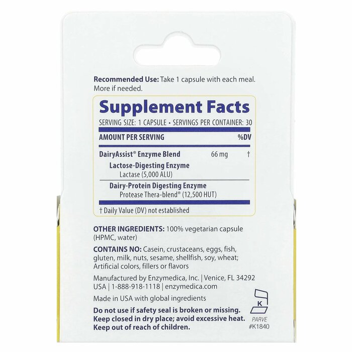 DairyAssist™ — это формула двойного действия, которая сочетает в себе лактазу, помогающую переваривать лактозу, и протеазу, которая помогает расщеплять казеин. Полное переваривание молочных продуктов может естественным образом уменьшить дискомфорт, который обычно появляется при непереносимости лактозы.