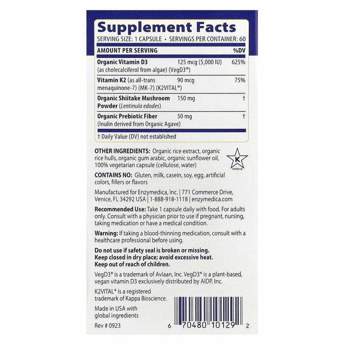 Комплексное сочетание витаминов D3, K2 и грибов шиитаке обеспечивает тройную поддержку иммунитета.