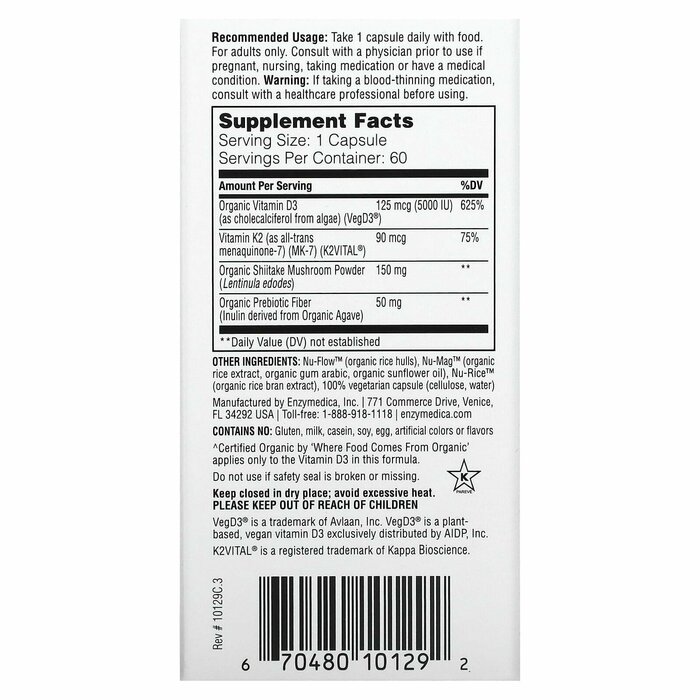 ^ Сертифицированный органический продукт по стандарту «Где пища из органического» относится только к витамину D3 в этой формуле.