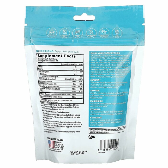 Force Factor® Happy Mood — это универсальная формула, которая помогает вам быстро почувствовать себя счастливее и расслабиться. Благодаря уникальной смеси витаминов, минералов и клинически изученного Zembrin® каждая доза питает ваше тело и разум, помогая успокоить нервы, снять стресс и повысить позитивный настрой. Изготовленная из растительных ингредиентов без искусственных красителей и подсластителей, всего одна вкусная жевательная таблетка в день — это все, что нужно, чтобы помочь вам повысить качество жизни.