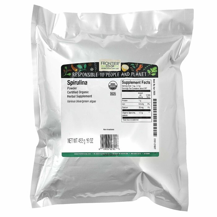 Спирулина - это общее название двух видов цианобактерий, сине-зеленых водорослей. Многие считают это растение самой мощной природной «зеленой» пищей. Порошок органической спирулины Frontier® с сильным травяным вкусом и острым морским вкусом можно использовать в смузи, смесях приправ, зеленых соусах, хумусе, фрикадельках и даже пирожных.