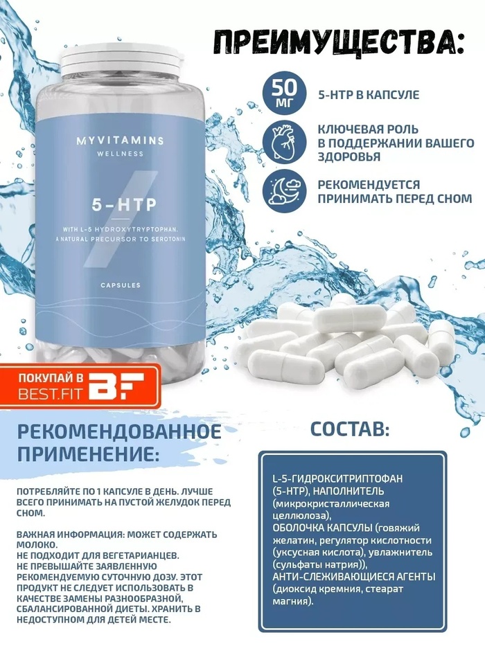 Гидрокситриптофан 5-HTP от Myprotein — это высококачественная добавка, содержащая 50 мг гидрокситриптофана в каждой капсуле. В упаковке находится 90 капсул, что обеспечивает длительный курс приема.