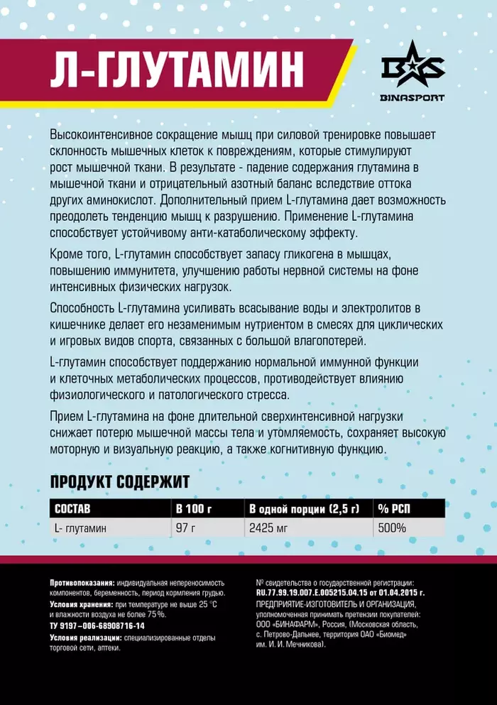 Глютамин Binasport L-Glutamine натуральный 500 гр. — это высококачественная добавка, предназначенная для поддержки мышечного восстановления и улучшения спортивных результатов. Продукт содержит чистый L-глютамин, который является важной аминокислотой для организма.