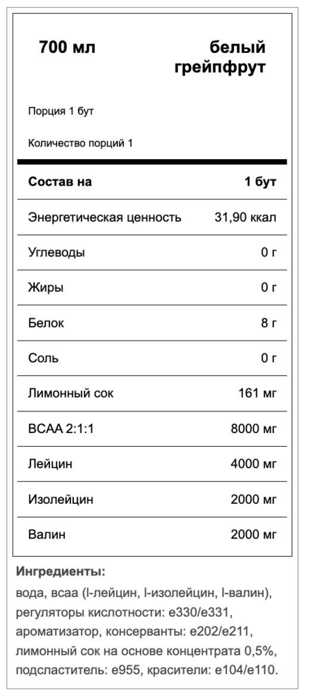 Готовые напитки QNT BCAA'S 8000 белый грейпрут — это отличный выбор для спортсменов и активных людей, стремящихся поддерживать уровень энергии и восстанавливать мышцы после тренировок. Объем упаковки составляет 700 мл, что позволяет удобно использовать напиток в любое время.