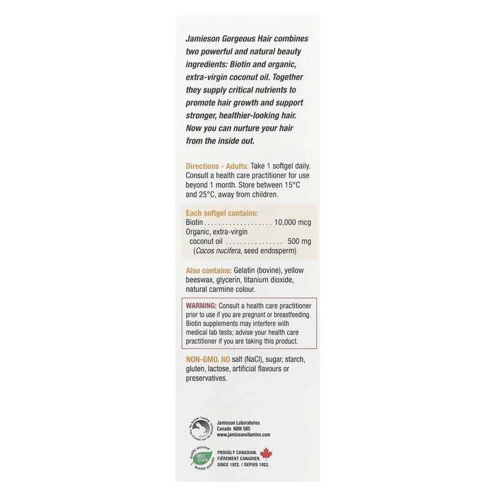 Jamieson Gorgeous Hair сочетает в себе два мощных и натуральных ингредиента для красоты: Биотин и органическое кокосовое масло холодного отжима. Вместе они обеспечивают жизненно важные питательные вещества, способствующие росту волос и поддерживающие их более крепкий и здоровый вид. Теперь вы можете ухаживать за волосами изнутри.