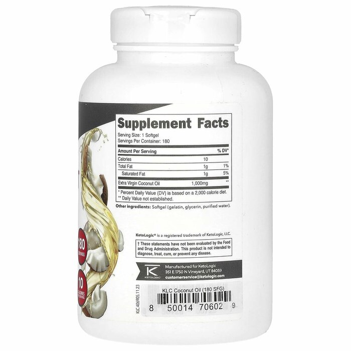 KetoLogic Нерафинированное кокосовое масло высшего качества (1000 мг), 180 капсул