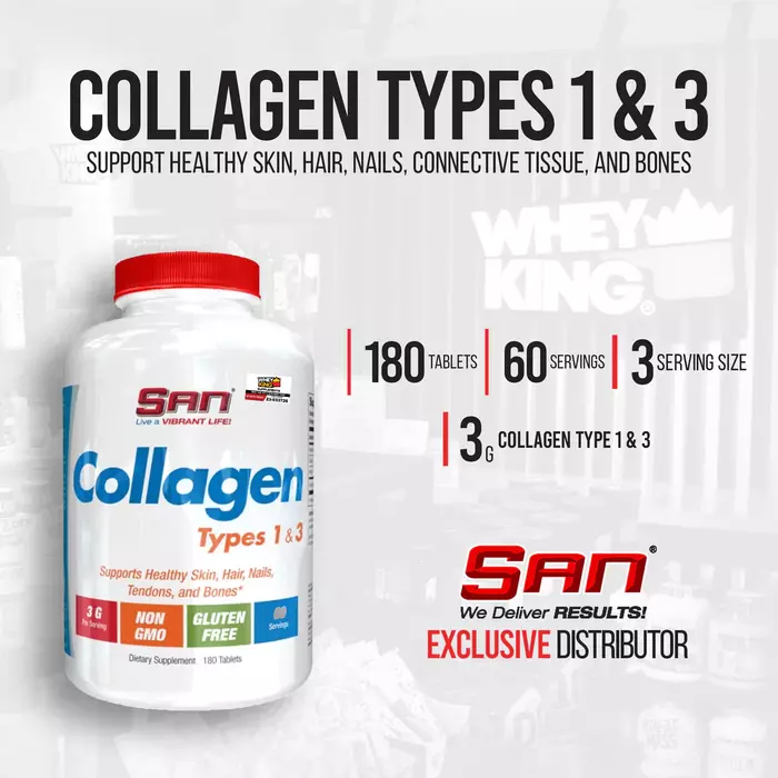 SAN Collagen Тип 1 и 3 — это передовой продукт в сфере спортивного и здорового питания, специально разработанный для поддержания красоты кожи, здоровья суставов и укрепления волос и ногтей. Этот продукт отличается высочайшим качеством и уникальным составом, который делает его незаменимым компонентом вашего ежедневного рациона.