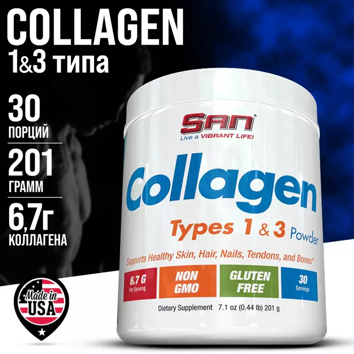 SAN Коллаген Тип 1 и 3, порошок, 201 г — это добавка, которая поддерживает здоровье кожи, суставов и соединительных тканей. Она содержит коллаген типов 1 и 3, которые являются основными составляющими для поддержания эластичности кожи и укрепления суставных тканей.