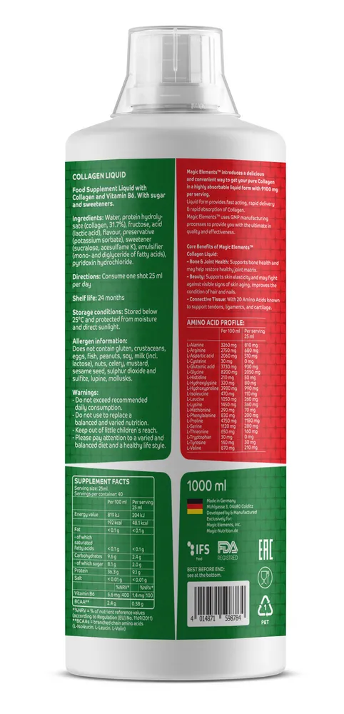 Коллаген Magic Elements Collagen Liquid ежевика — это высококачественный жидкий коллаген, который поддерживает здоровье кожи, волос и суставов. В каждой упаковке содержится 1000 мл продукта с насыщенным вкусом ежевики, который легко вписывается в ваш ежедневный рацион.