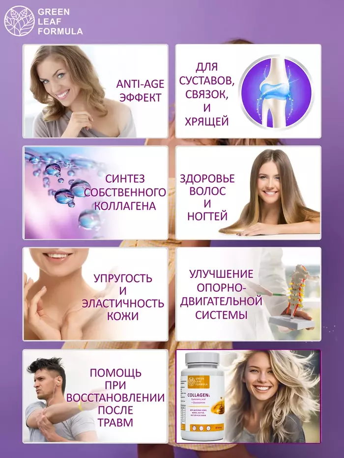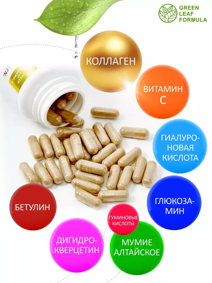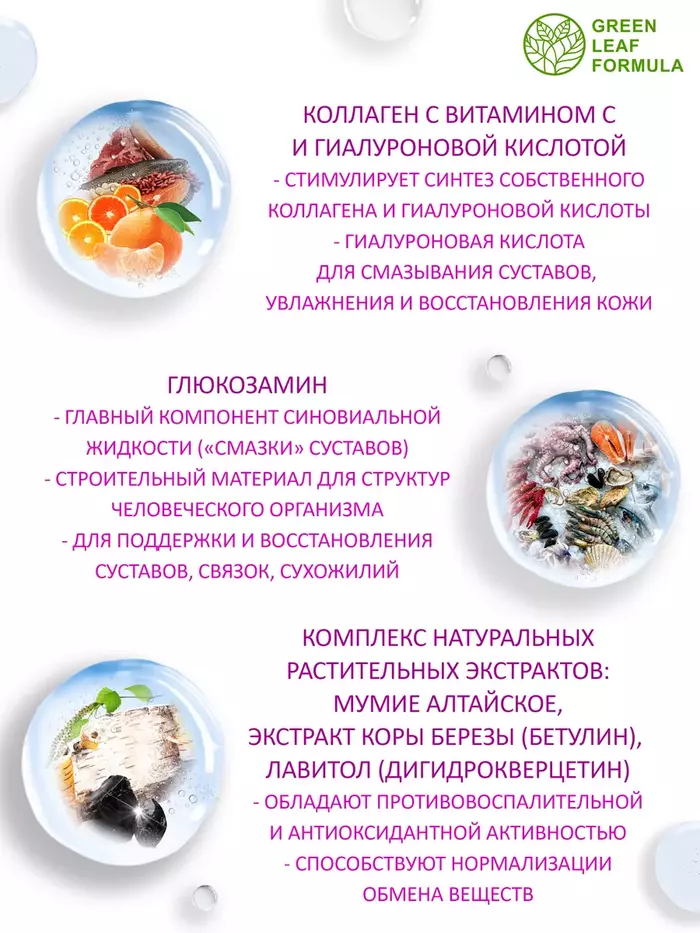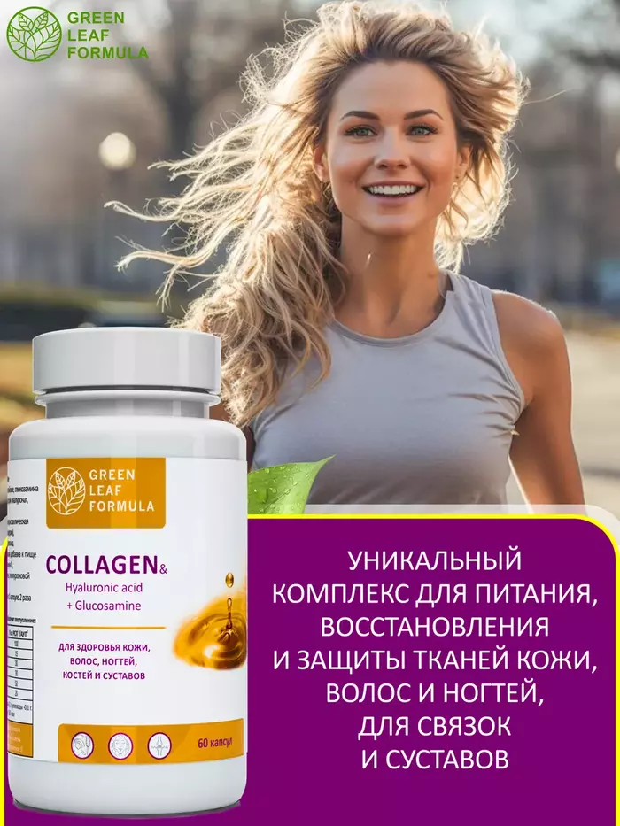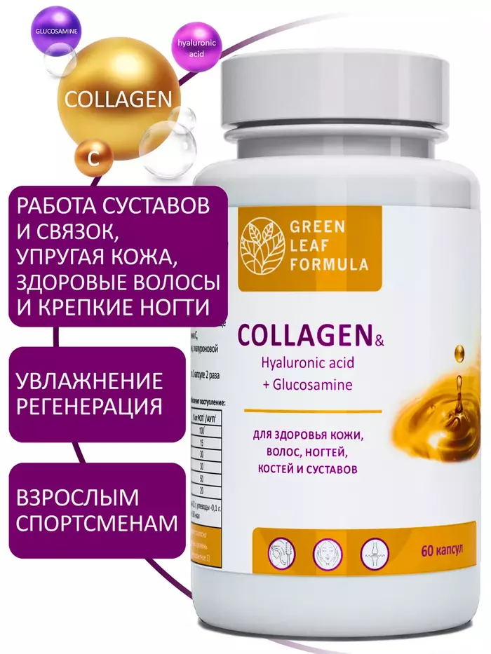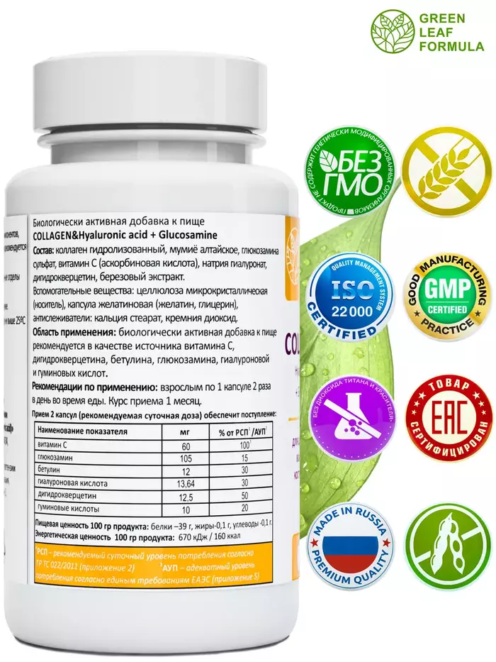 COLLAGEN Hyaluronic acid + Glucosamine – уникальный комплекс для питания, восстановления и защиты соединительной ткани, а также для спортивного питания на основе следующих компонентов: коллаген гидролизованный и витамин С, гиалуроновая кислота, глюкозамин, мумие алтайское и дигидрокверцетин, бетулин.Говяжий коллаген, используемый в препарате, применяется как для улучшения здоровья суставов, так и для красоты и омоложения кожи, как витамины для женщин и мужчин, витамины для кожи и волос.Коллаген животный является отличным выбором, если есть аллергия на моллюсков.Благодаря своему составу БАД: незаменим для улучшения подвижности суставов; способствует снятию болевого синдрома во время восстановления после травм или физических нагрузок; улучшает функциональное состояние опорнодвигательной системы; способствует консолидации переломов костей; эффективен в комплексной терапии при дегенеративнодистрофических заболеваниях; эффективен в комплексной терапии травматических поражений опорнодвигательного аппарата.Гиалуроновая кислота и коллаген с витамином С обеспечивают тканям упругость, увлажненность и эластичность, позволяют выводить токсины и поддерживать водный баланс, предотвращают преждевременное старение кожи, стимулируют синтез собственного коллагена и гиалуроновой кислоты.Глюкозамин и гидролизованный коллаген ускоряют процесс обновления соединительной ткани, участвуют в образовании суставных хрящей, связок и сухожилий. Кроме того, глюкозамин участвует в образовании суставных хрящей, связок и сухожилий.Комплекс натуральных растительных компонентов: высокоочищенное мумие алтайское (гуминовые кислоты), экстракт коры березы (бетулин), лавитол (дигидрокверцетин) способствуют нормализации обмена веществ, а также обладают противовоспалительной и антиоксидантной активностью.Не содержит: диоксид титана, химический краситель, ГМО, сою, глютен.Витамины и БАДы Green Leaf Formula это забота о вашем здоровье каждый день.Вся наша продукция сертифицирована и изготавливается на одном из ведущих российских производств, проходя многоэтапный контроль качества. Непрерывный лабораторный контроль входного сырья и готовой продукции ведется лабораторией, аккредитованной в национальной системе Росаккредитации. Соответствие международным стандартам ISO 22 000 : 2005, GMP и серьезная научная база гарантируют потребителю приобретение продукта высочайшего качества.