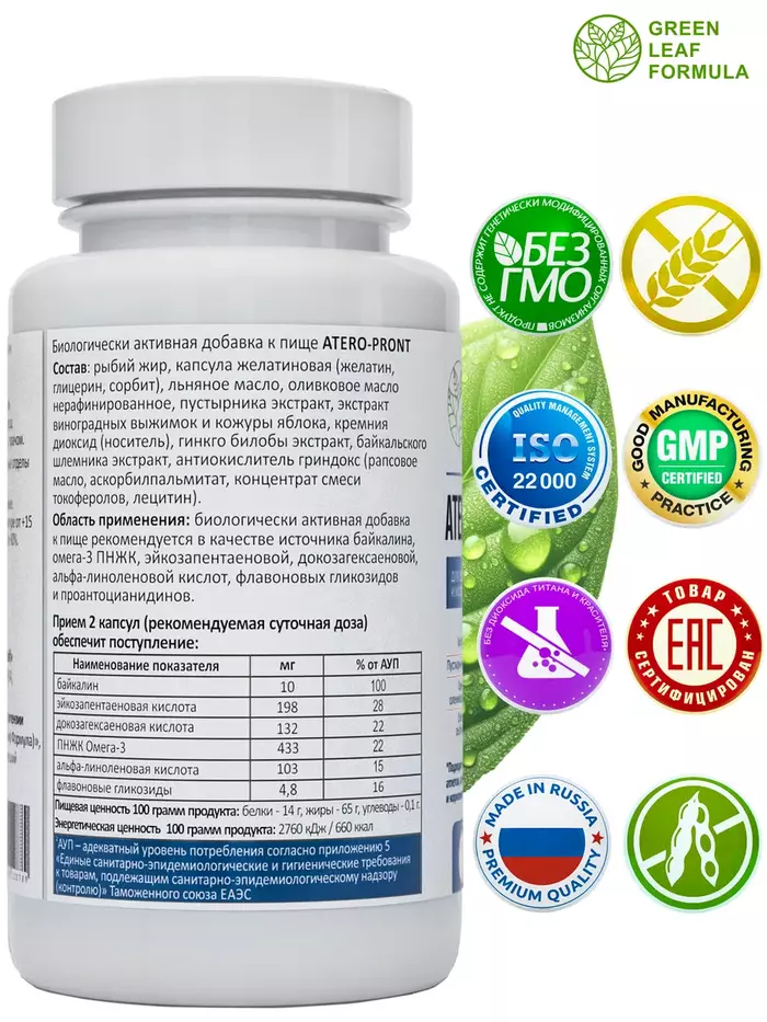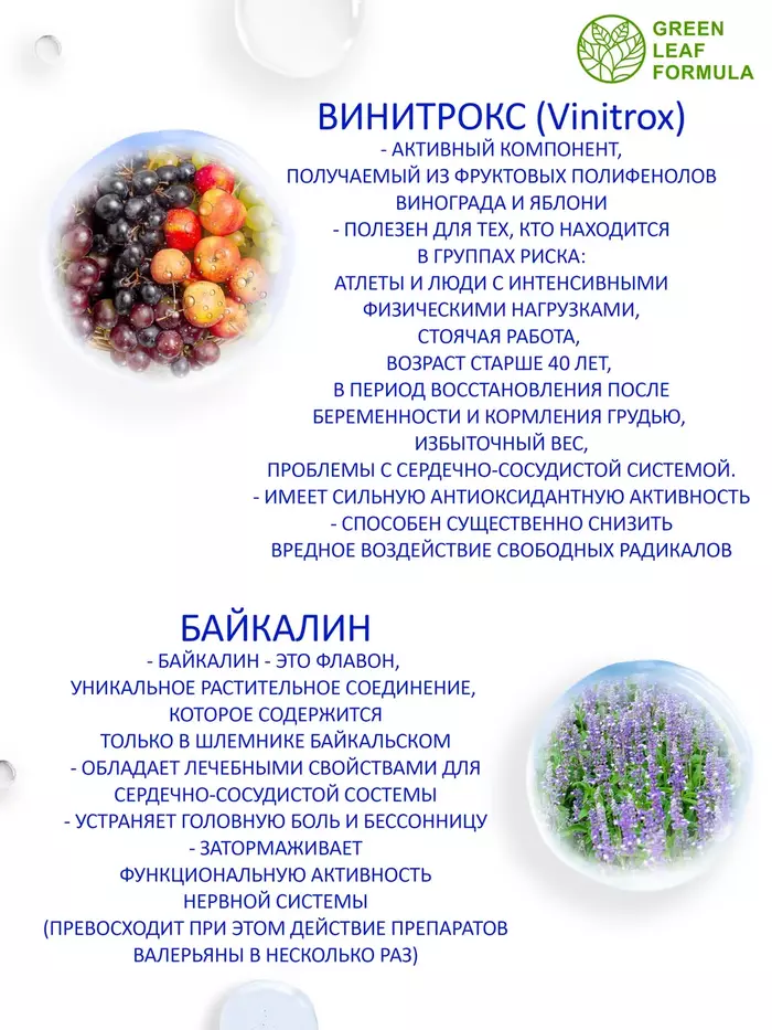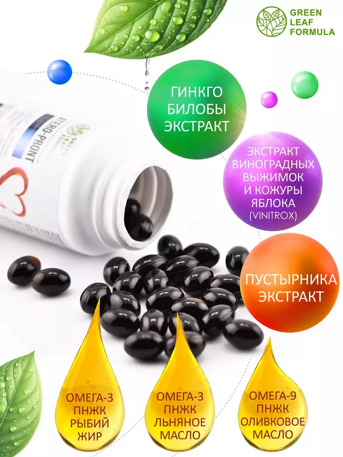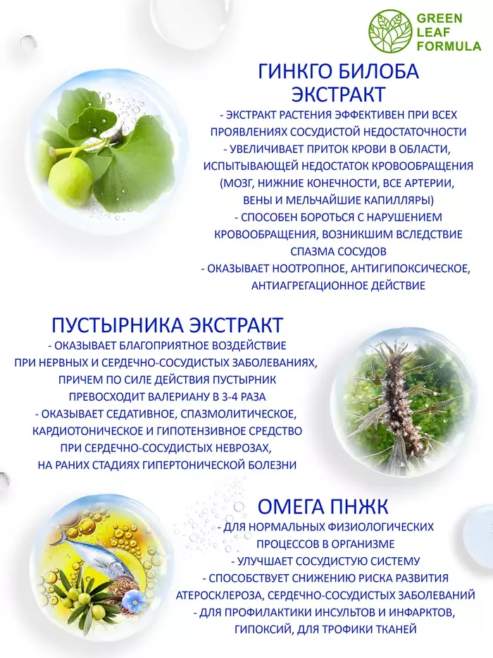 Уникальный комбинированный комплекс для поддержания здоровья сердечнососудистой системы, профилактики атеросклероза, нормализации артериального давления, микроциркуляции и системного кровообращение в целом, для улучшения кровообращения мозга и работы нервной системы. Витамины для женщин и мужчин, людям со стоячей работой, в возрасте старше 40 лет, с избыточным весом, с проблемами с сердечнососудистой системой, с нарушениями мозгового кровообращения, для спортсменов , в период восстановления после беременности и кормления грудью.Фитокомплекс на основе растительных экстрактов богатых ценными полифенолами, тритерпеноидами и флавоноидами, незаменимых жирных кислот. Препарат, благодаря своему богатейшему составу и синергии действия его компонентов:• эффективен для профилактики инсультов и инфарктов, гипоксий и атеросклероза;• нормализует артериальное давление, микроциркуляцию и системное кровообращение в целом; усиливает выносливость физических нагрузок (за счет компонента Винитрокс (Vinitrox)); способствует снижению уровня холестерина в крови; эффективно снижает проницаемость и ломкость капилляров, нормализует реологические свойства крови; оказывает мягкое воздействие и улучшает функциональную деятельность сердечнососудистой и нервной систем; расширяет сосуды и предупреждает их повреждение гормонами стресса; улучшает мозговое кровообращение; способствует устранению головной боли и бессонницы; оказывает ноотропное, антигипоксическое, антиагрегационное действие; • способствует улучшению когнитивных функций, улучшает память и способность к обучению; оказывает седативный и антиспазматический эффект на нервную систему. Винитрокс (Vinitrox) активный компонент, получаемый из фруктовых полифенолов винограда и яблони, оказывающий сосудорасширяющее действие. Запатентованная научнообоснованная субстанция, разработанная изначально для удовлетворения специфических потребностей спортсменов, но широко применяемая другими категориями потребителей. Гинкго билоба экстракт оказывает ноотропное, антигипоксическое, антиагрегационное действие. Способствует улучшению когнитивных функций, улучшает память и способность к обучению. Улучшает мозговое кровообращение и снабжение мозга кислородом и глюкозой, увеличивает приток крови в области, испытывающие недостаток кровообращения и так далее. Шлемник байкальский расширяет и укрепляет кровеносные сосуды, замедляет ритм сердечных сокращений, устраняет головную боль и бессонницу, снижает и стабилизирует артериальное давление, обладает антистрессовой активностью. Пустырника экстракт седативное, спазмолитическое, кардиотоническое и гипотензивное средство при сердечнососудистых неврозах, на ранних стадиях гипертонической болезни, легких формах стенокардии, заболеваниях сердечной мышцы и пороках сердца. Эффективнее валерианы в 34 раза. Омега3 рыбий жир улучшает реологические свойства крови, требуется для нормального функционирования мозга, эффективна для снижения холестерина, профилактики атеросклероза, гипертонической болезни и др. сердечнососудистых заболеваний. Омега3 льняное масло снижает уровень холестерина в организме, способствует очистке и укреплению стенок сосудов. Омега9 оливковое масло снижает риск развития сердечнососудистых заболеваний, диа