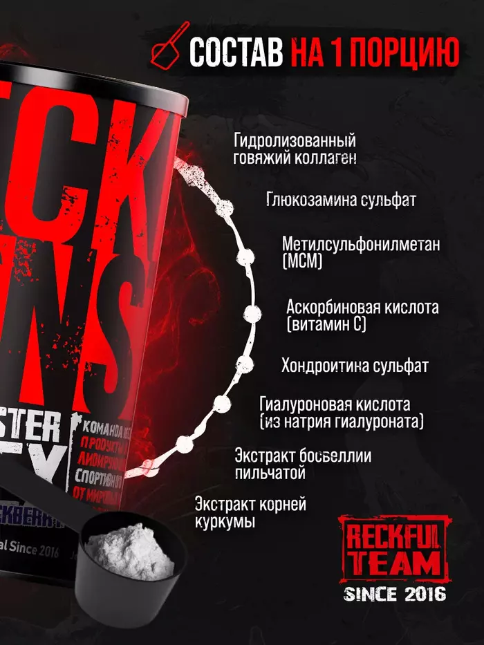 Комплекс для суставов и связок Monster Flex от Reckful — это высококачественный продукт, созданный для поддержки здоровья ваших суставов и связок. В каждой упаковке содержится 300 г порошка с вкусом ежевики, который легко растворяется и удобно использовать.