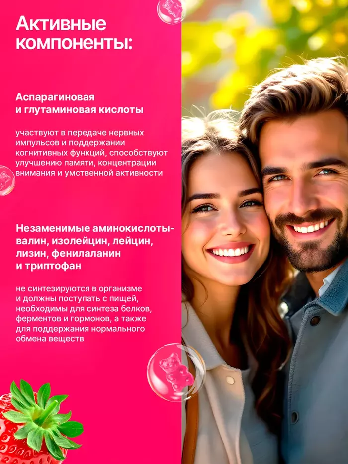 Комплекс с коллагеном и незаменимыми аминокислотами в виде мармеладныхпастилок отличное решение для тех, кто не любит глотать таблетки и капсулы.Мармеладные пастилки со вкусом клубники содержат следующие микроэлементы иаминокислоты: коллаген рыбный, аспарагиновая кислота, треонин, серин, глутаминовая кислота, глицин, аланин, валин, изолейцин, лейцин, фенилаланин+тирозин, лизин, гистидин, аргинин, пролин, метионин+цистин, триптофан.Коллаген применяется для улучшения здоровья суставов и для красоты и омоложения кожи и оказывает следующие действия: улучшает подвижность суставов; способствует снятию болевого синдрома во время восстановления после травм илифизических нагрузок; улучшает функциональное состояние опорнодвигательной системы; способствует консолидации переломов костей; эффективен в комплексной терапии при дегенеративнодистрофическихзаболеваниях; в комплексной терапии травматических поражений опорнодвигательного аппарата.Аспарагиновая и глутаминовая кислоты участвуют в передаче нервных импульсов и поддержании когнитивных функций, способствуют улучшению памяти, концентрации внимания и умственной активности.Незаменимые аминокислоты валин, изолейцин, лейцин, лизин, фенилаланин и триптофан, не синтезируются в организме и должны поступать с пищей, необходимы для синтеза белков, ферментов и гормонов, а также для поддержания нормального обмена веществ.Пролин и глицин являются важными компонентами коллагена и способствуют поддержанию эластичности и упругости кожи.Аргинин играет важную роль в регуляции кровообращения и иммунной функции.Метионин и цистин необходимы для детоксикации организма и защиты клеток отповреждений.Рекомендации по применению: принимать по 1 мармеладке 2 раза в день. Курсовойприем 1 мес.