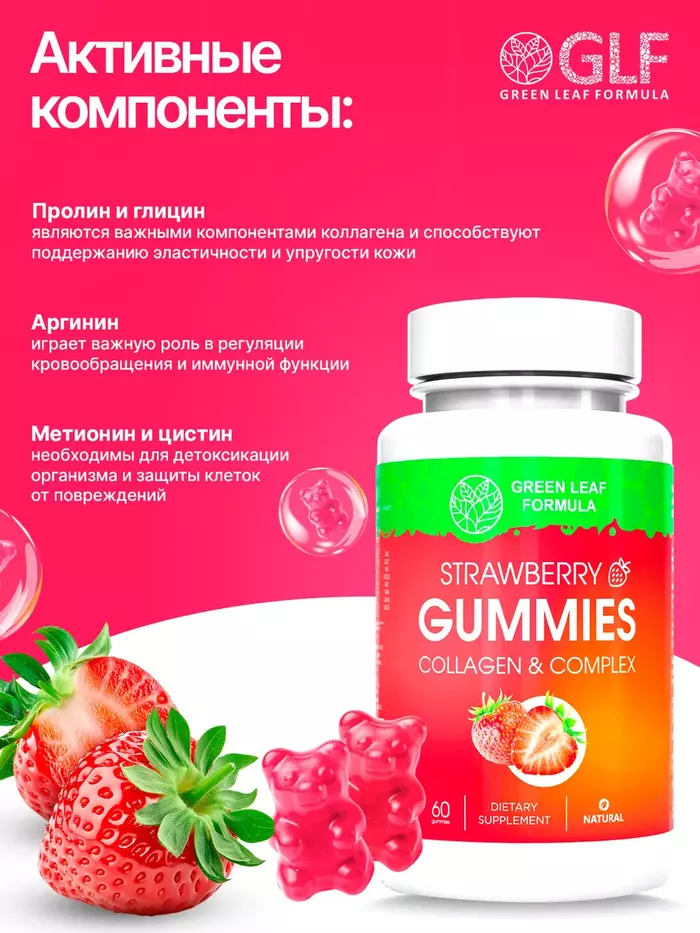 GREEN LEAF FORMULA Комплекс с коллагеном Клубника, 60 жевательных пастилок
