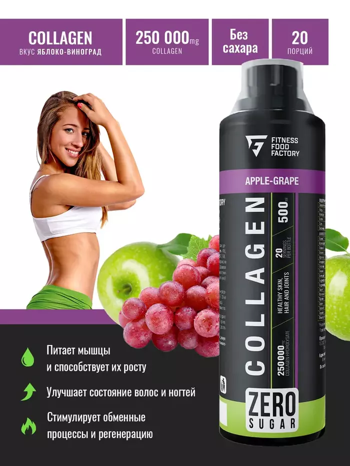 Коллаген Яблоко - виноград от бренда Fitness Food Factory — это высококачественный продукт, содержащий 250000 мг коллагена в каждой упаковке объемом 500 мл. Он идеально подходит для поддержания здоровья кожи, волос и суставов.