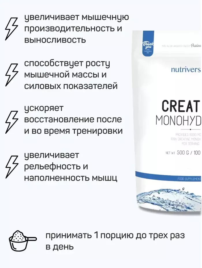 Nutriversum Creatine Monohydrate не содержит добавленных сахаров и искусственных красителей, что делает его идеальным выбором для спортсменов, следящих за своим питанием. Продукт подходит для всех видов тренировок и может использоваться как в период набора массы, так и в процессе сушки.