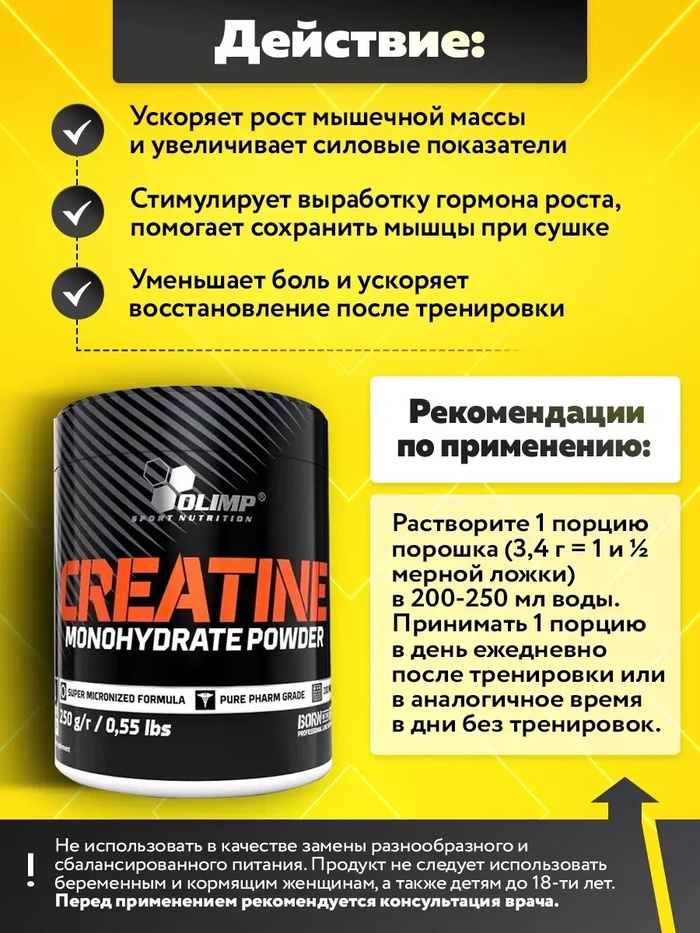• Увеличение силы: Креатин помогает повысить уровень энергии в мышцах, что позволяет выполнять более интенсивные тренировки.