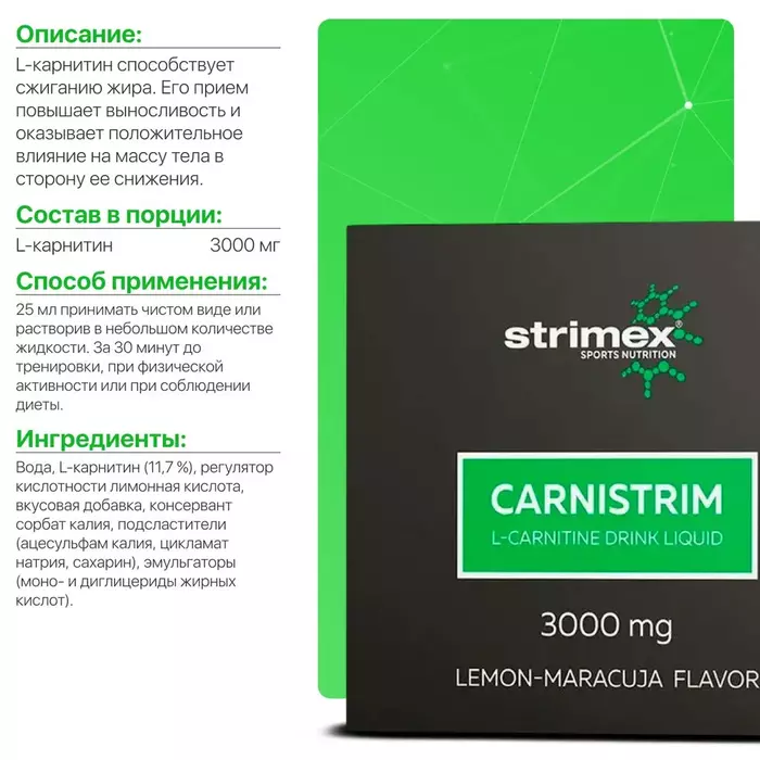 Л-Карнитин Strimex имеет освежающий вкус лимон-маракуя, что делает его приятным для употребления. Продукт подходит как для профессиональных спортсменов, так и для любителей фитнеса, желающих улучшить свои результаты.